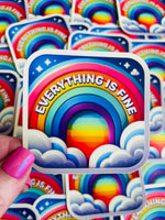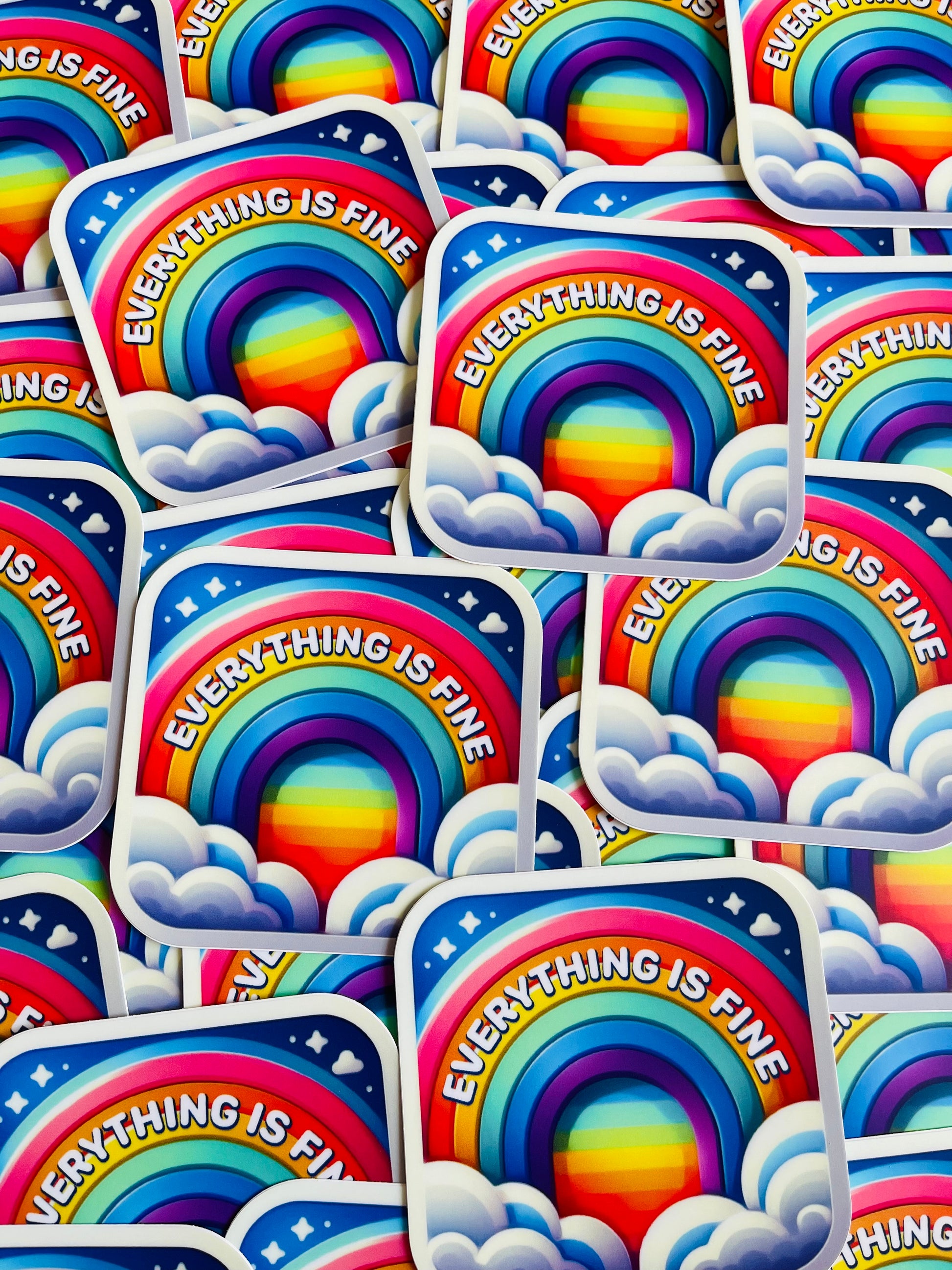 These colorful art stickers feature a whimsical rainbow sky with Everything is Fine text.