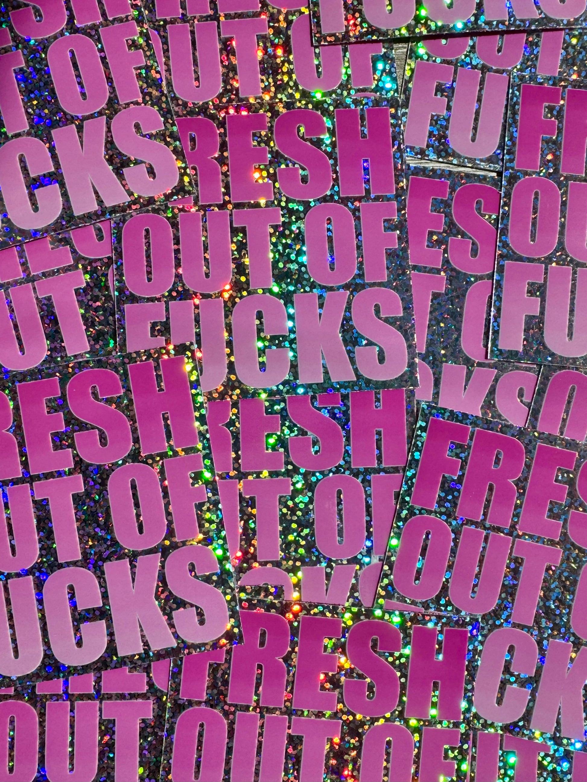 These colorful art stickers feature pink gradient text on holographic glitter vinyl that flashes a rainbow of colors in the light. Nobody will be able to say they didn't realize you were out of fucks to give.