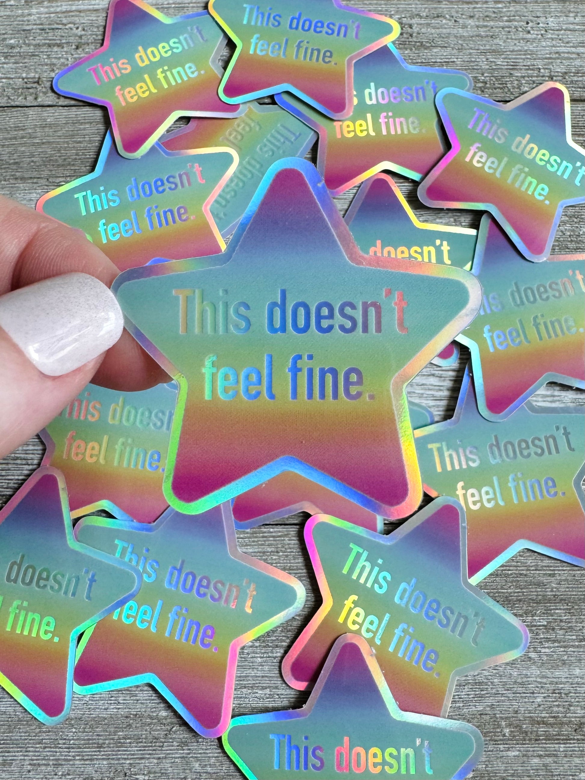 These colorful art stickers feature a pastel rainbow gradient with text that reads "this doesn't feel fine" on holographic vinyl that flashes a rainbow of colors in the light.
