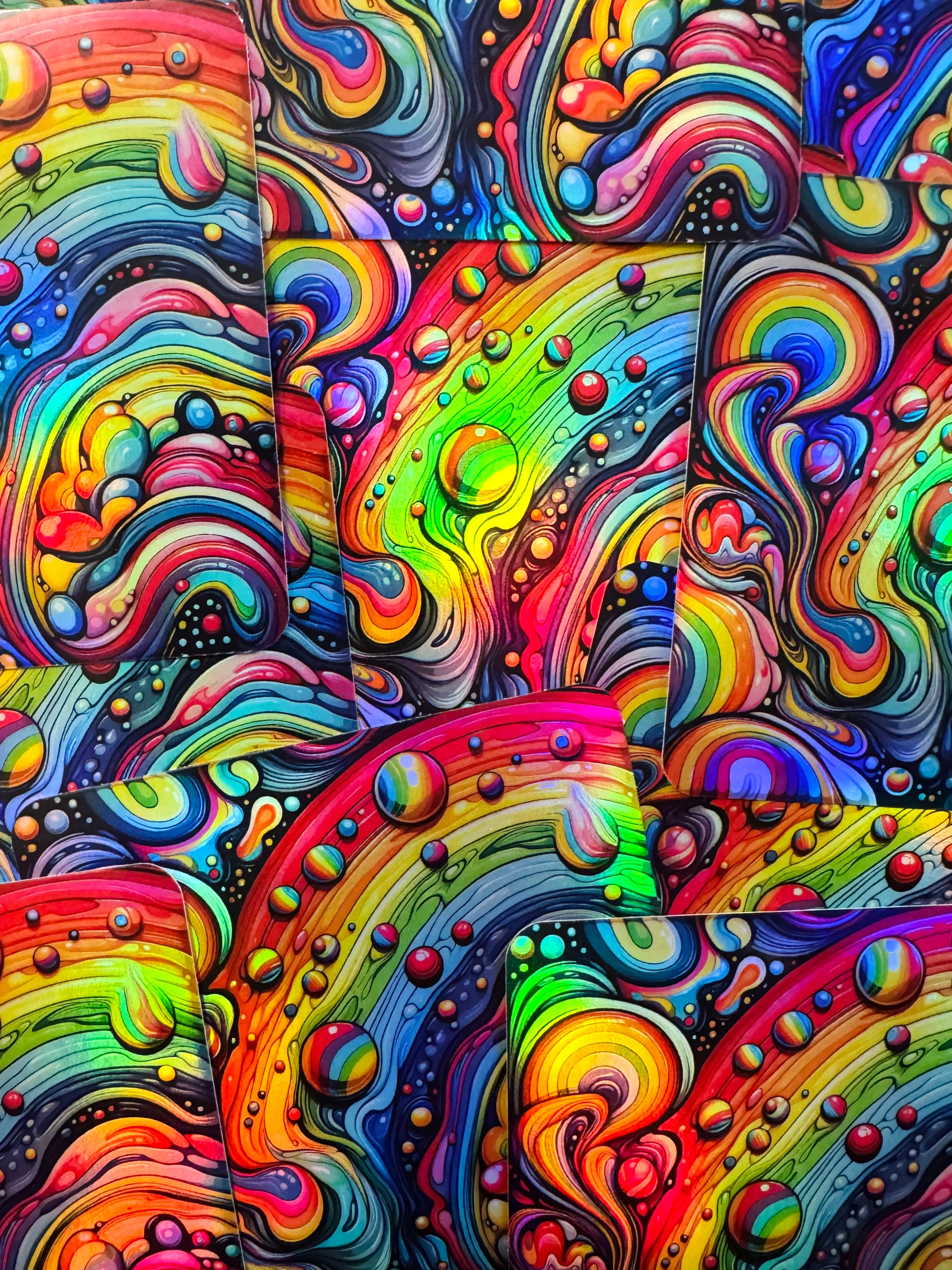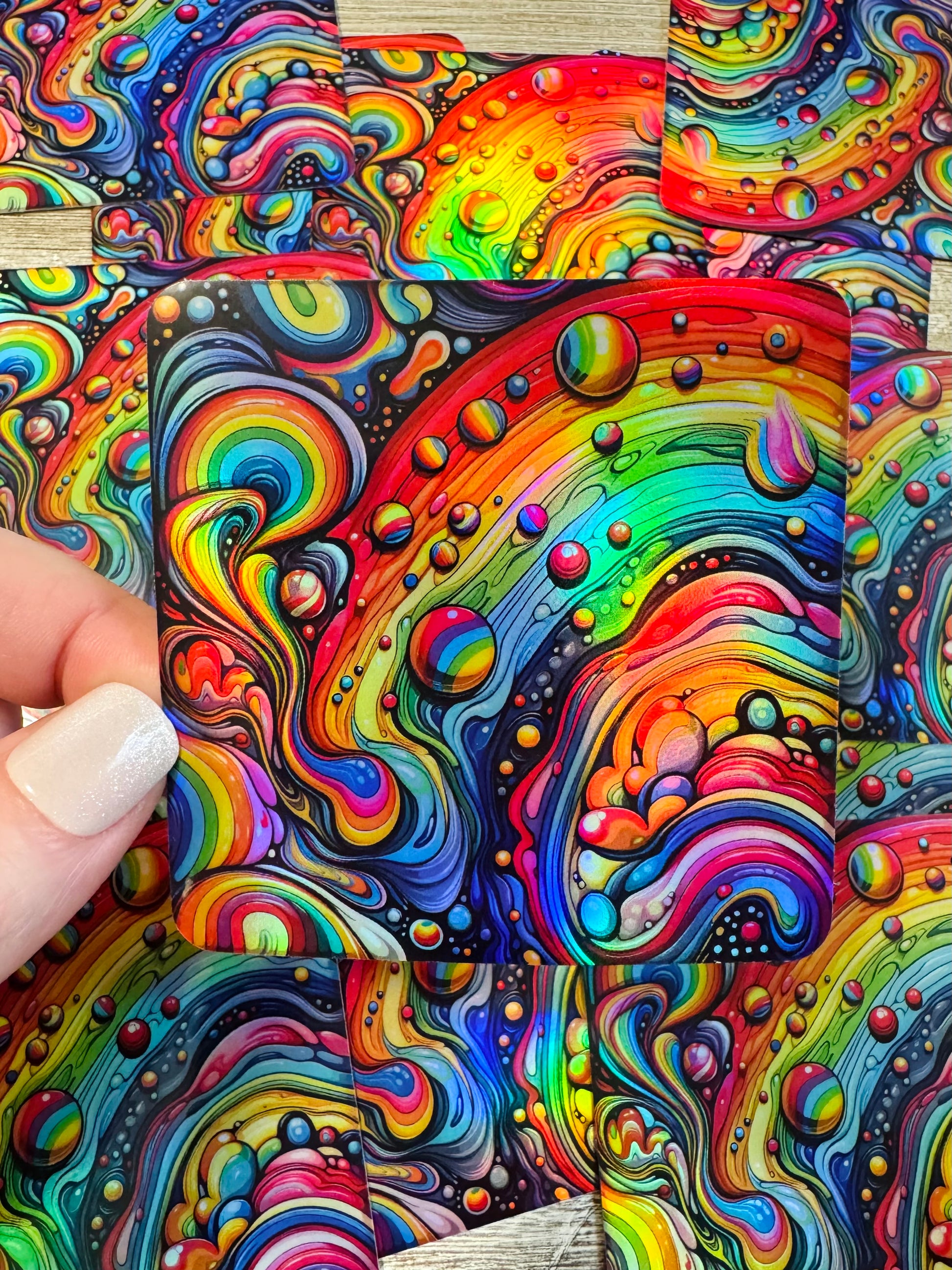 These vibrant art stickers feature a rainbow wave of color on holographic vinyl that flashes a rainbow of colors in the light.