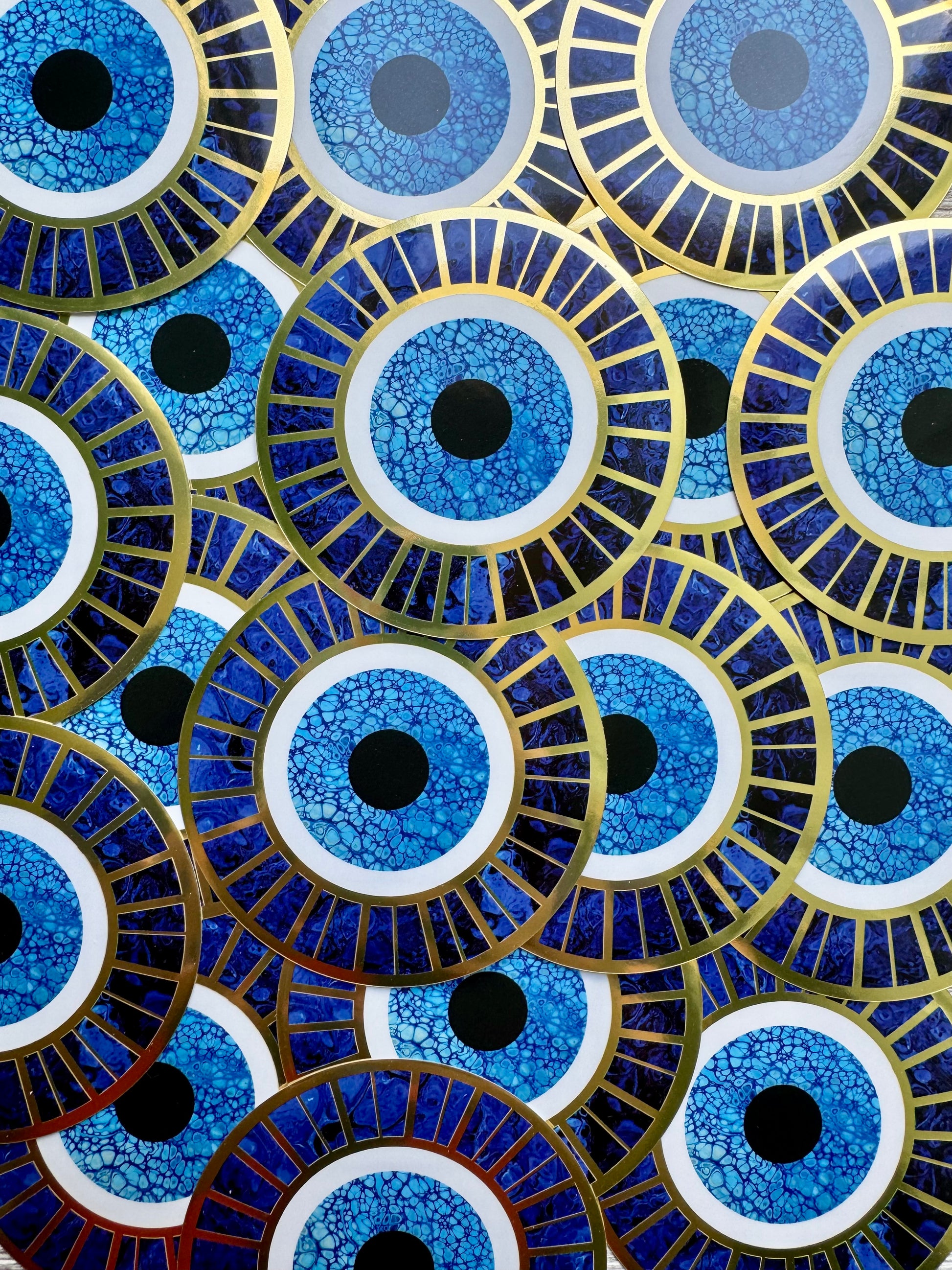 The evil eye symbol wards off the evil eye, which is a curse motivated by the envy of others that can bring about bad things in your life. These gold-accented evil eye symbol art stickers feature a collage of my paintings to protect against the evil eye.