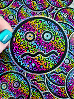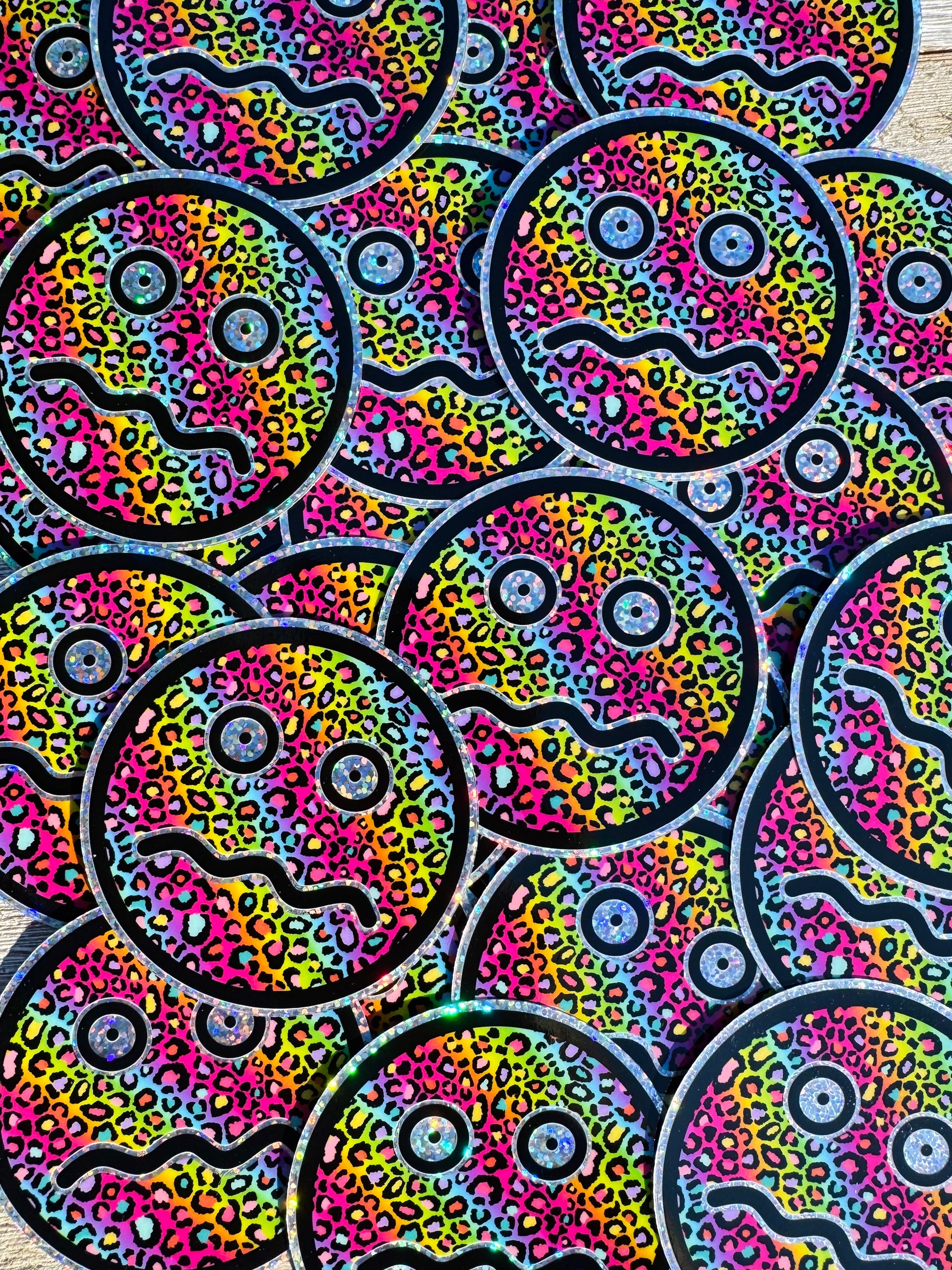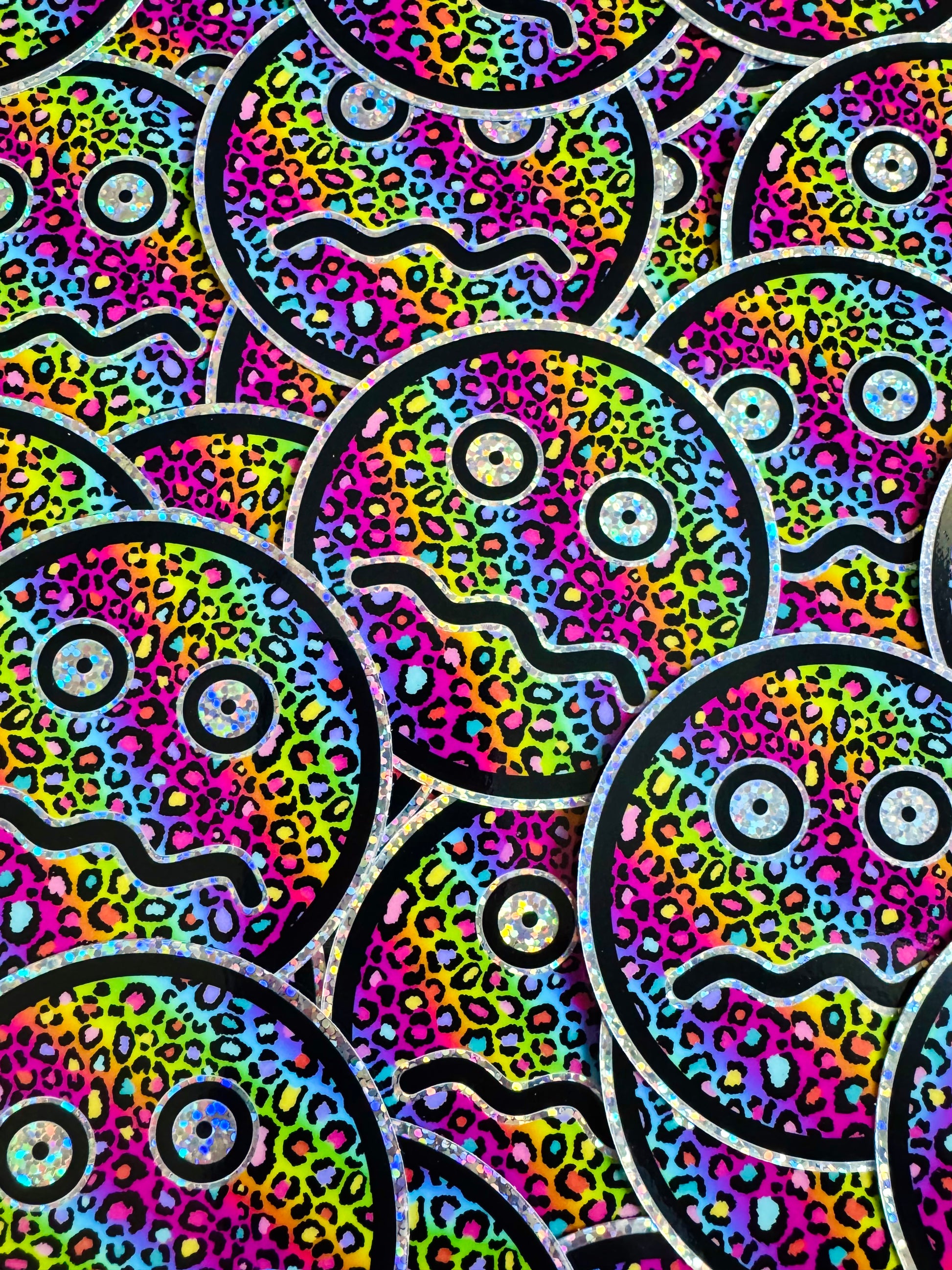 These colorful art stickers feature a bright neon leopard print anxiety face and holographic glitter vinyl that flashes a rainbow of colors in the light.