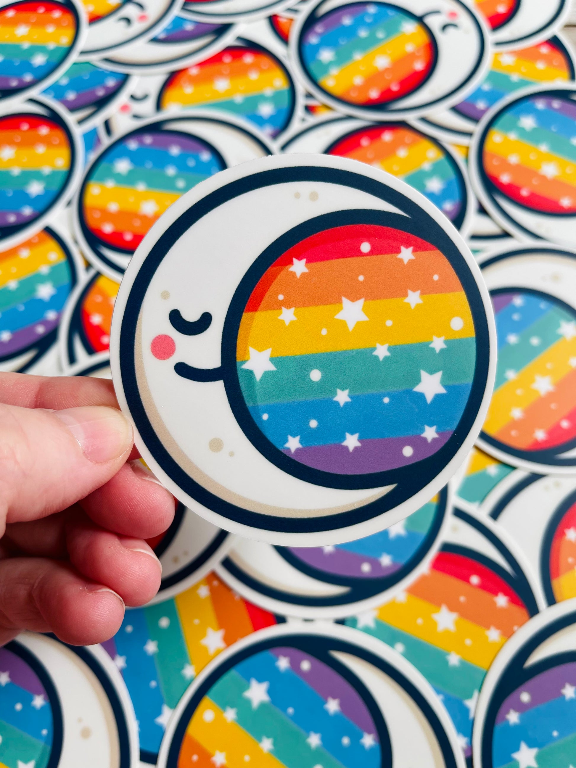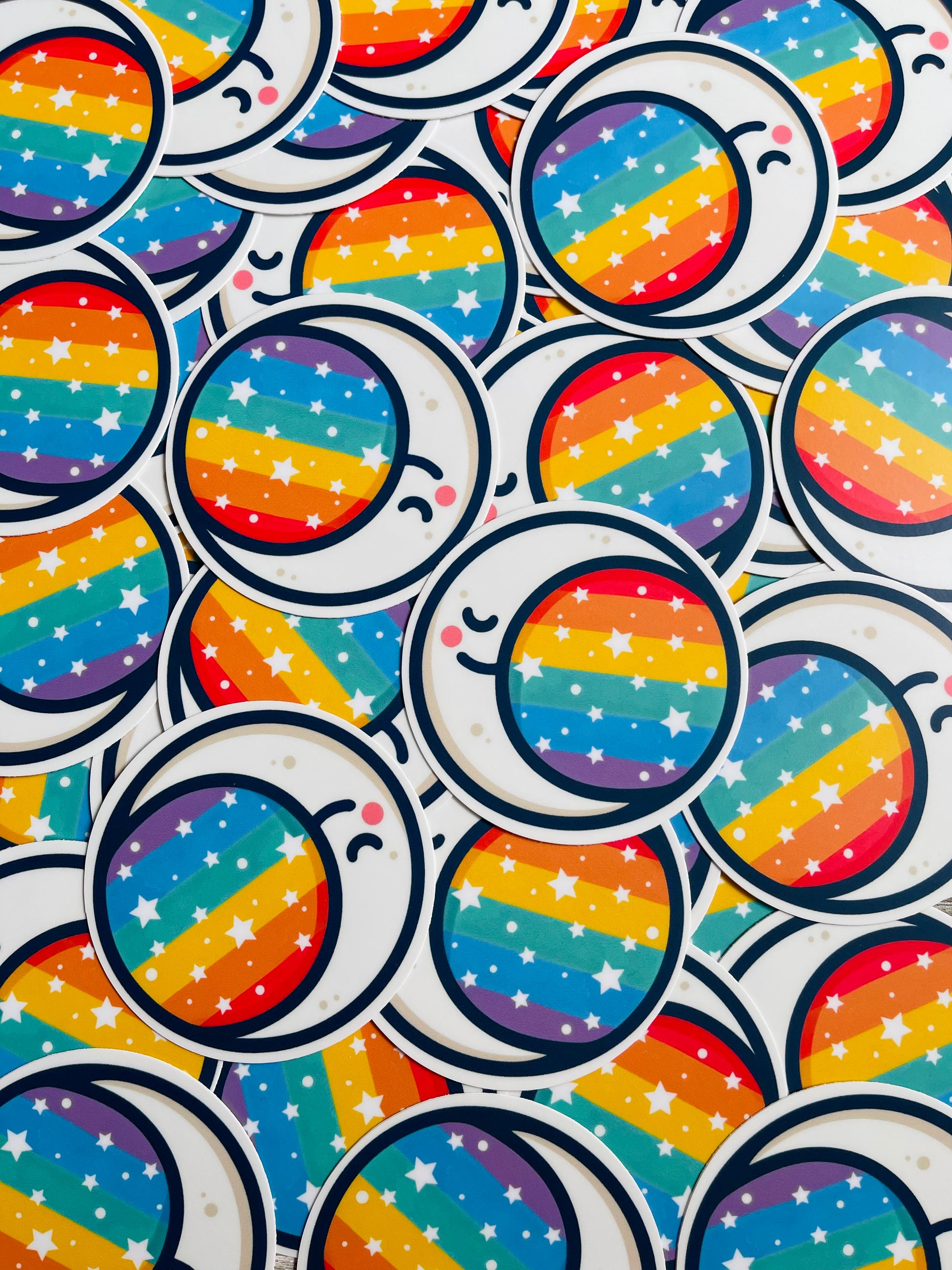 These colorful art stickers feature a sleepy moon with a rainbow sky scattered with stars.