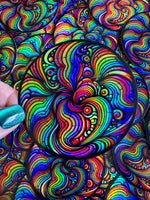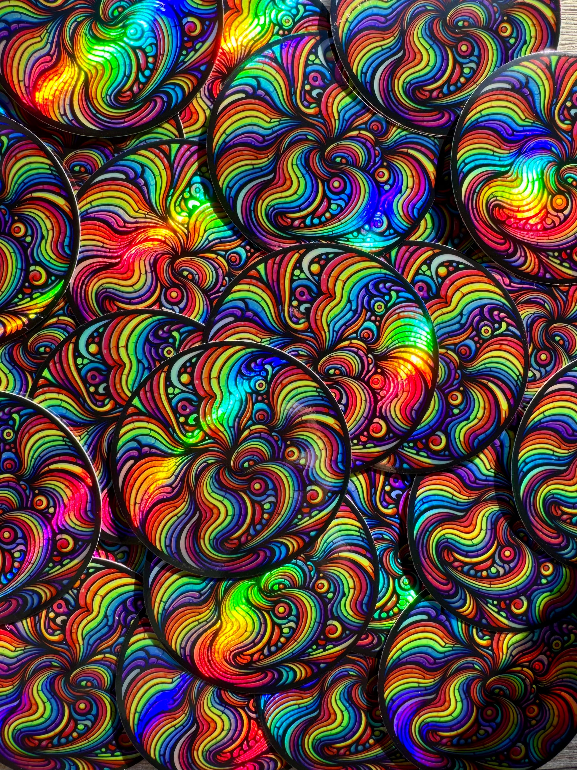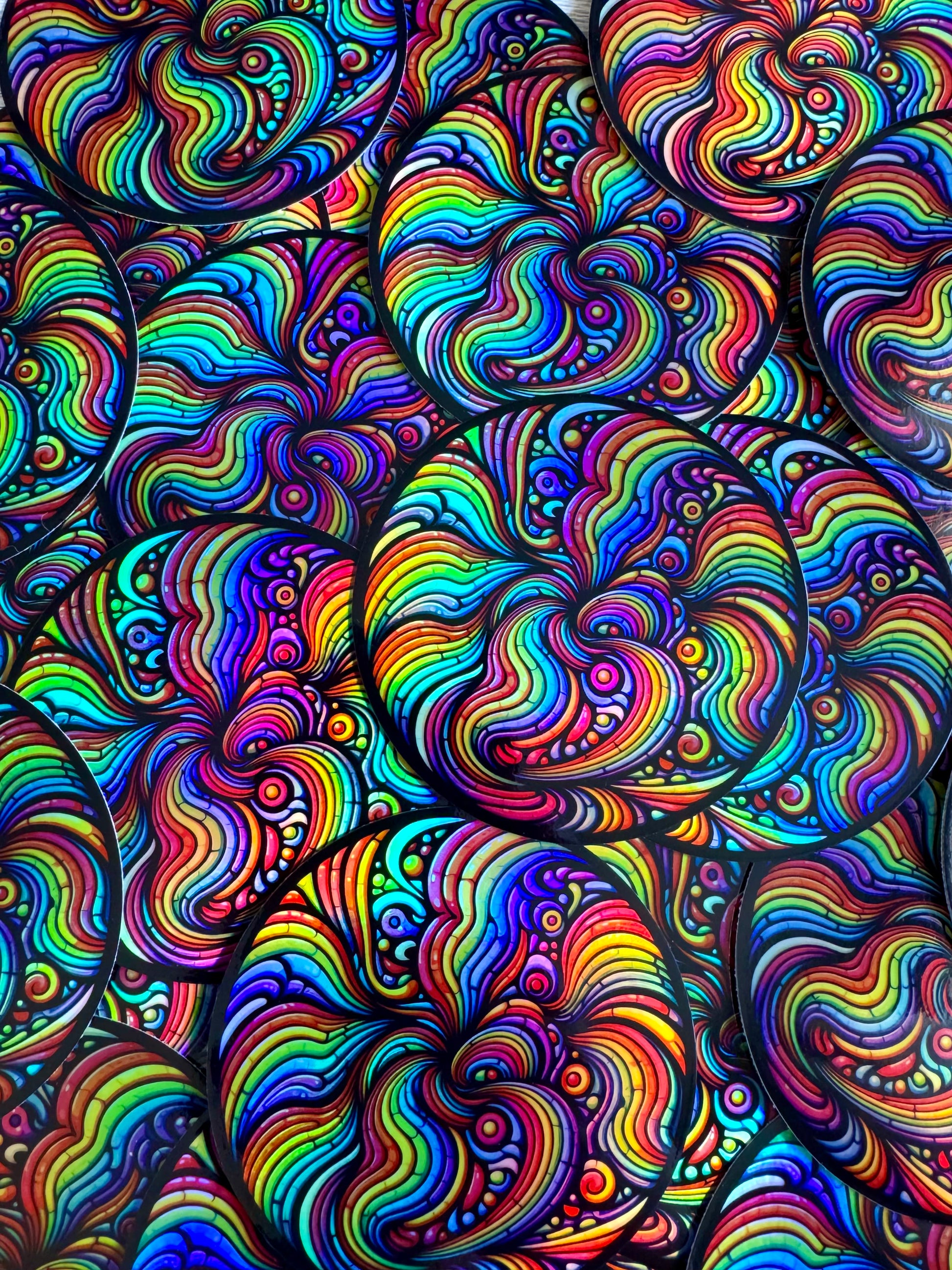 These vibrant art stickers feature rainbow swirl art on holographic vinyl that flashes a rainbow of colors in the light.