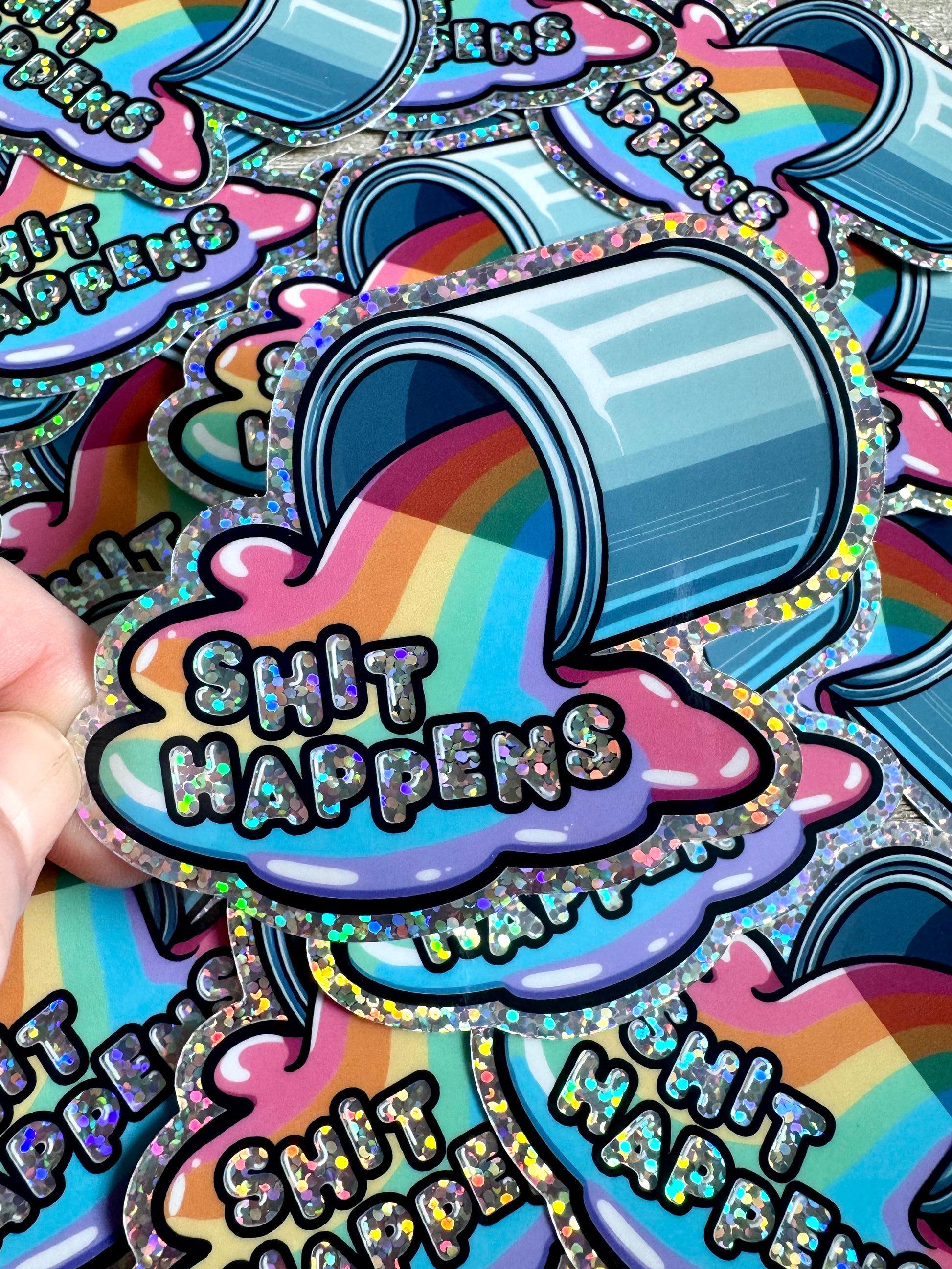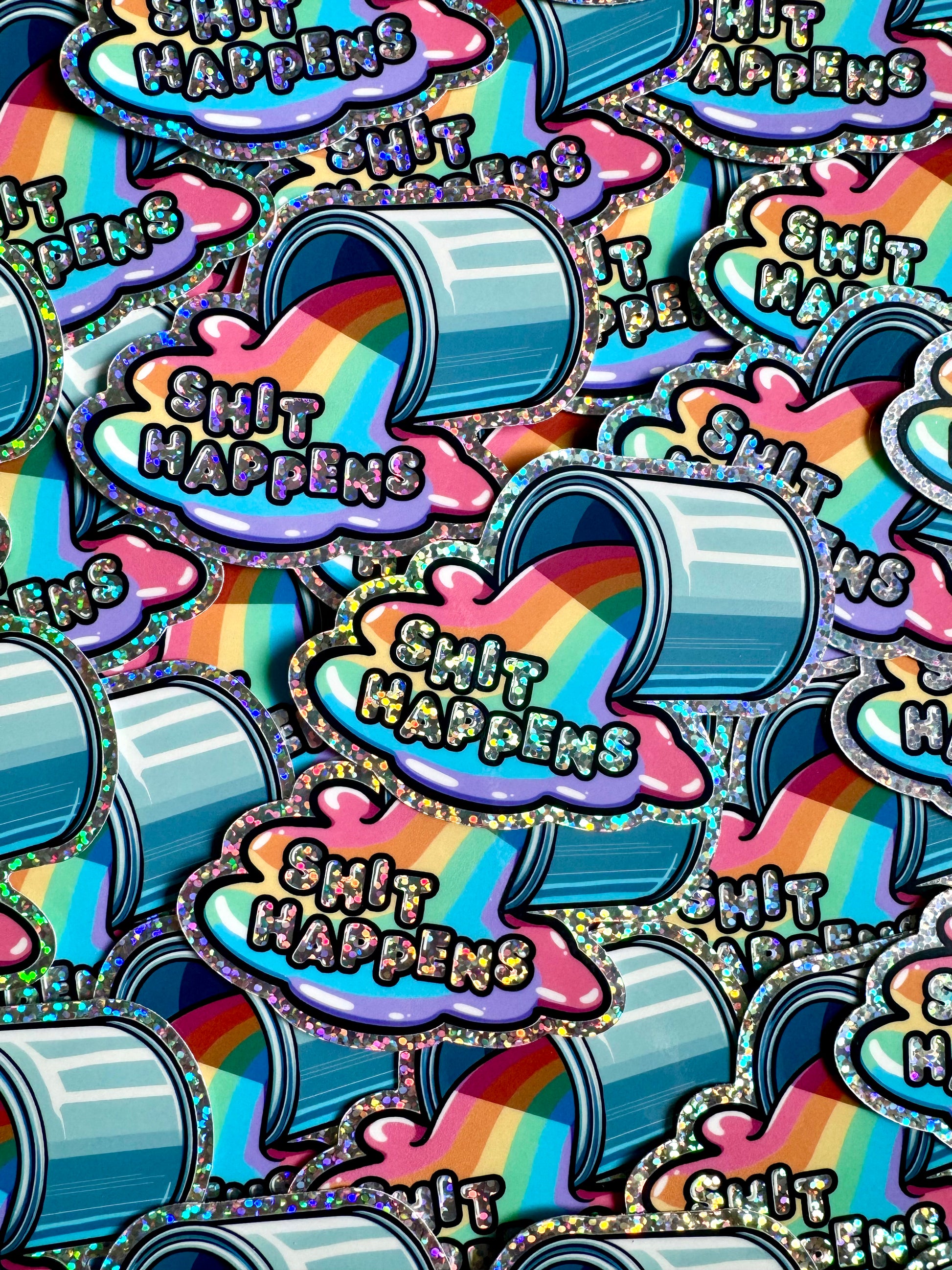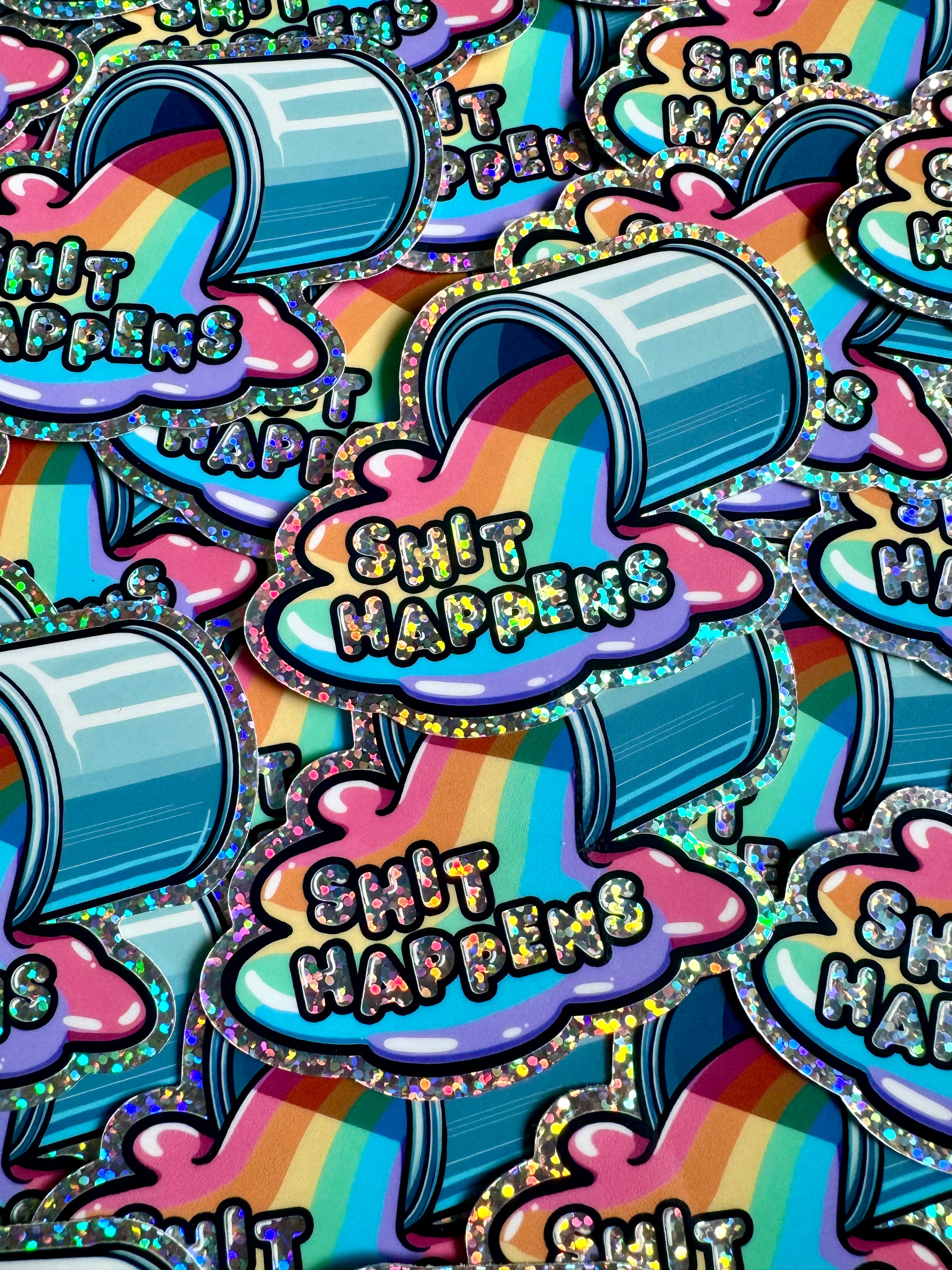 Don't cry over spilled rainbows, shit happens. These colorful art stickers feature holographic glitter vinyl that flashes a rainbow of colors in the light.