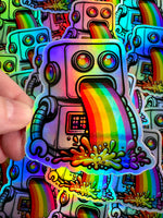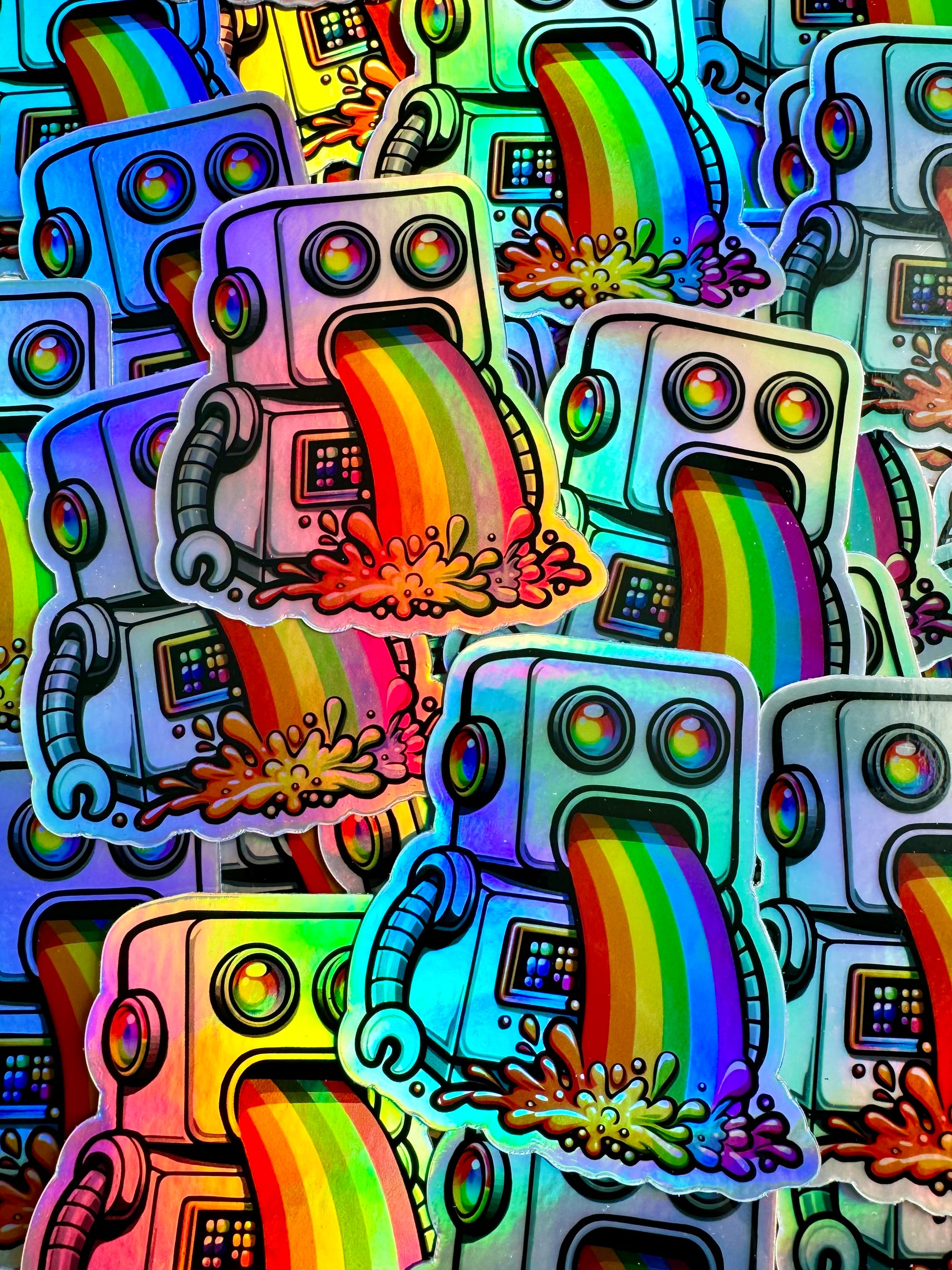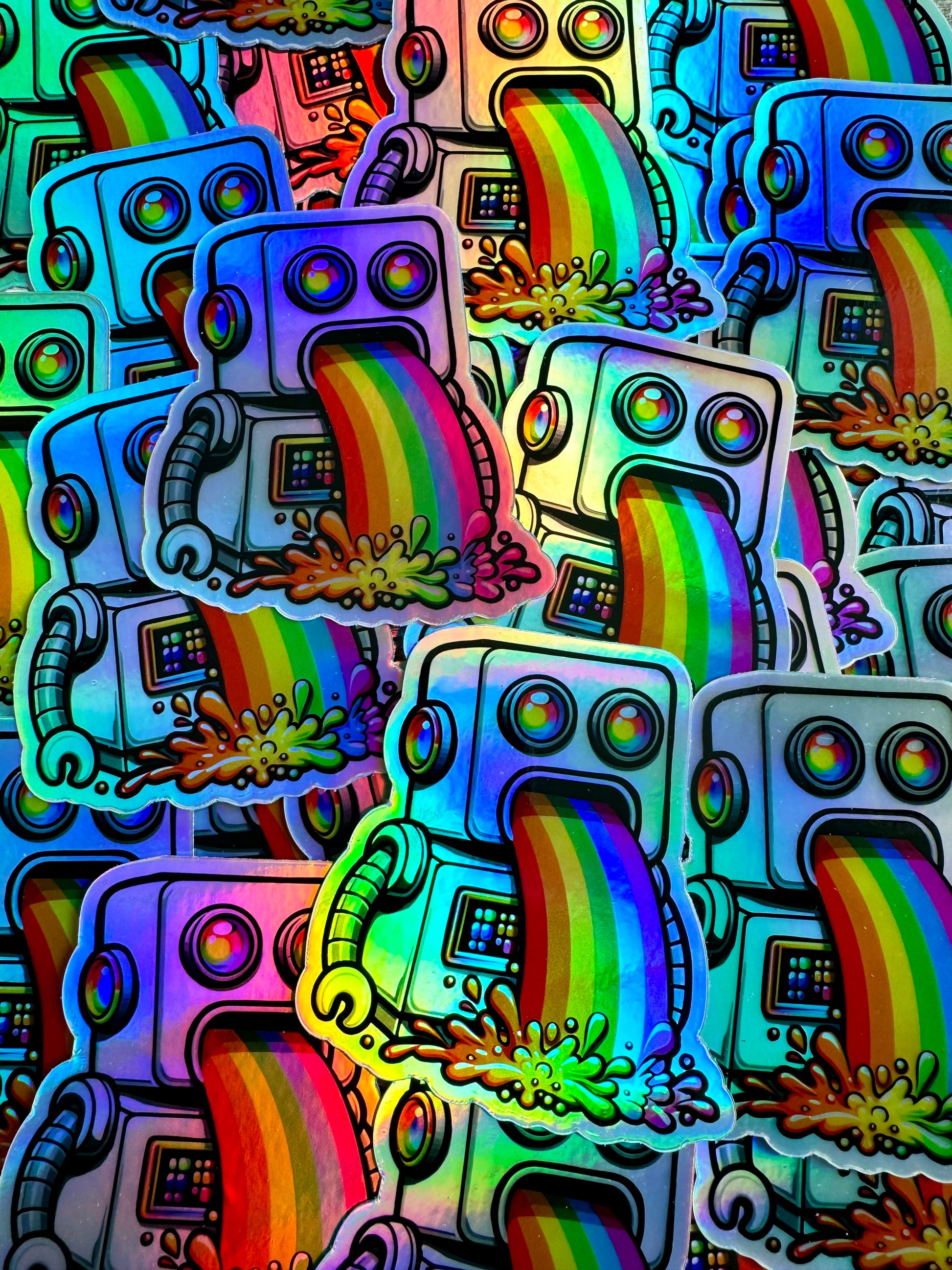 These vibrant art stickers feature an extremely accurate real-life depiction of Nikki barfing out rainbow goodness on holographic vinyl that flashes a rainbow of colors in the light.