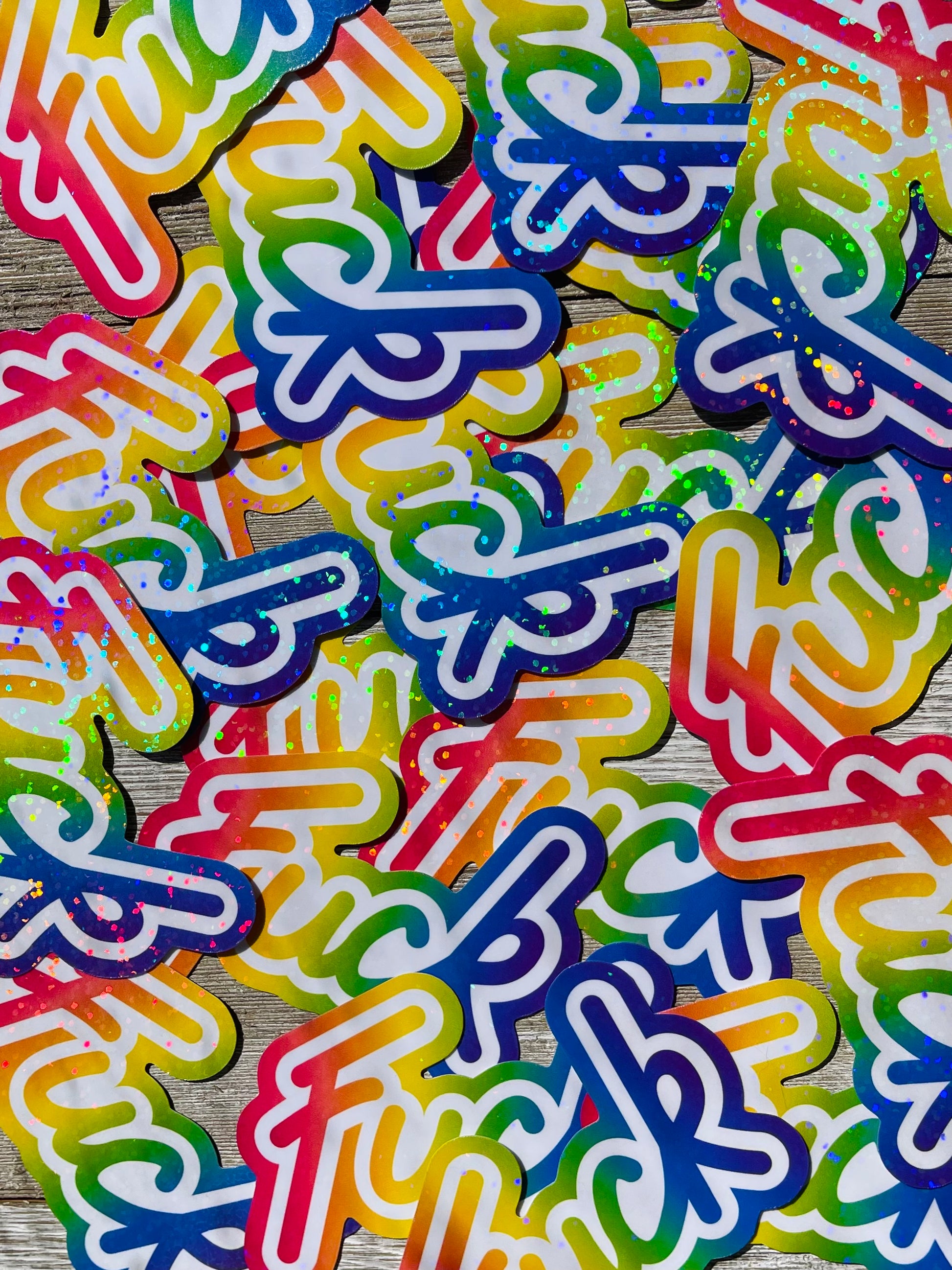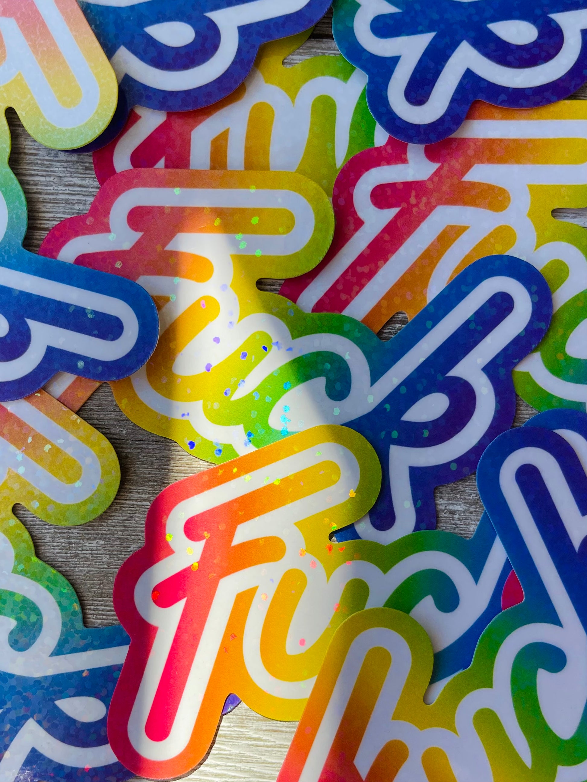 These bright rainbow word art stickers feature a design that any 90s kid (or anyone with good taste) will appreciate with holographic dots that flash a rainbow of colors in the light.