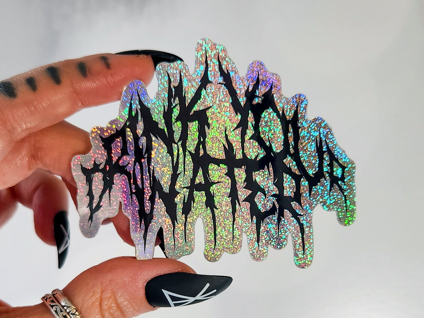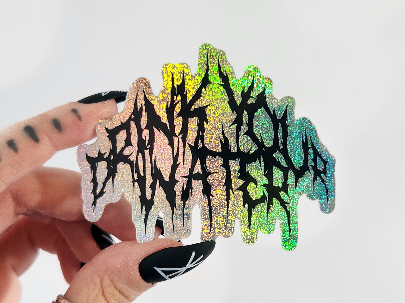 "Drink your water" is written on the front in the heavy metal band logo font in black with a holographic background, with "or you'll die" in the same font written on the back paper!