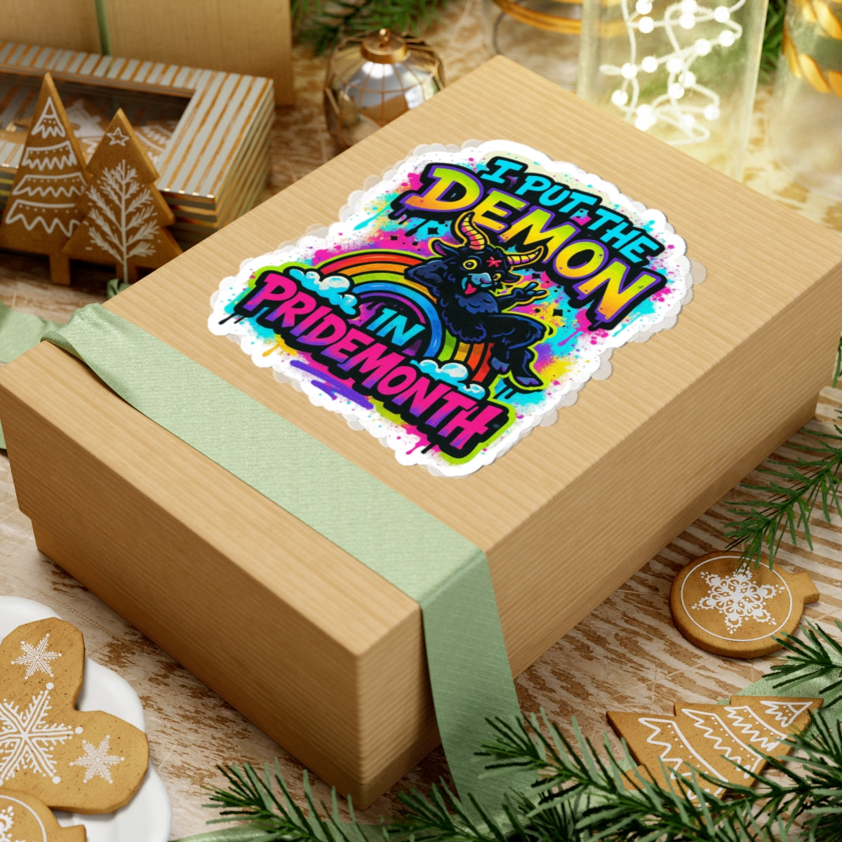 A vibrant and edgy sticker that says “I put the demon in pride month” in graffiti style. Perfect for adults looking to add a unique touch to their laptops, journals, or windows. Ideal for celebrating Pride Month.
