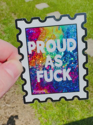 Bespattered Facade "Proud as Fuck" Rainbow Pride Month Forever Postage Stamp Holographic Glitter Sticker