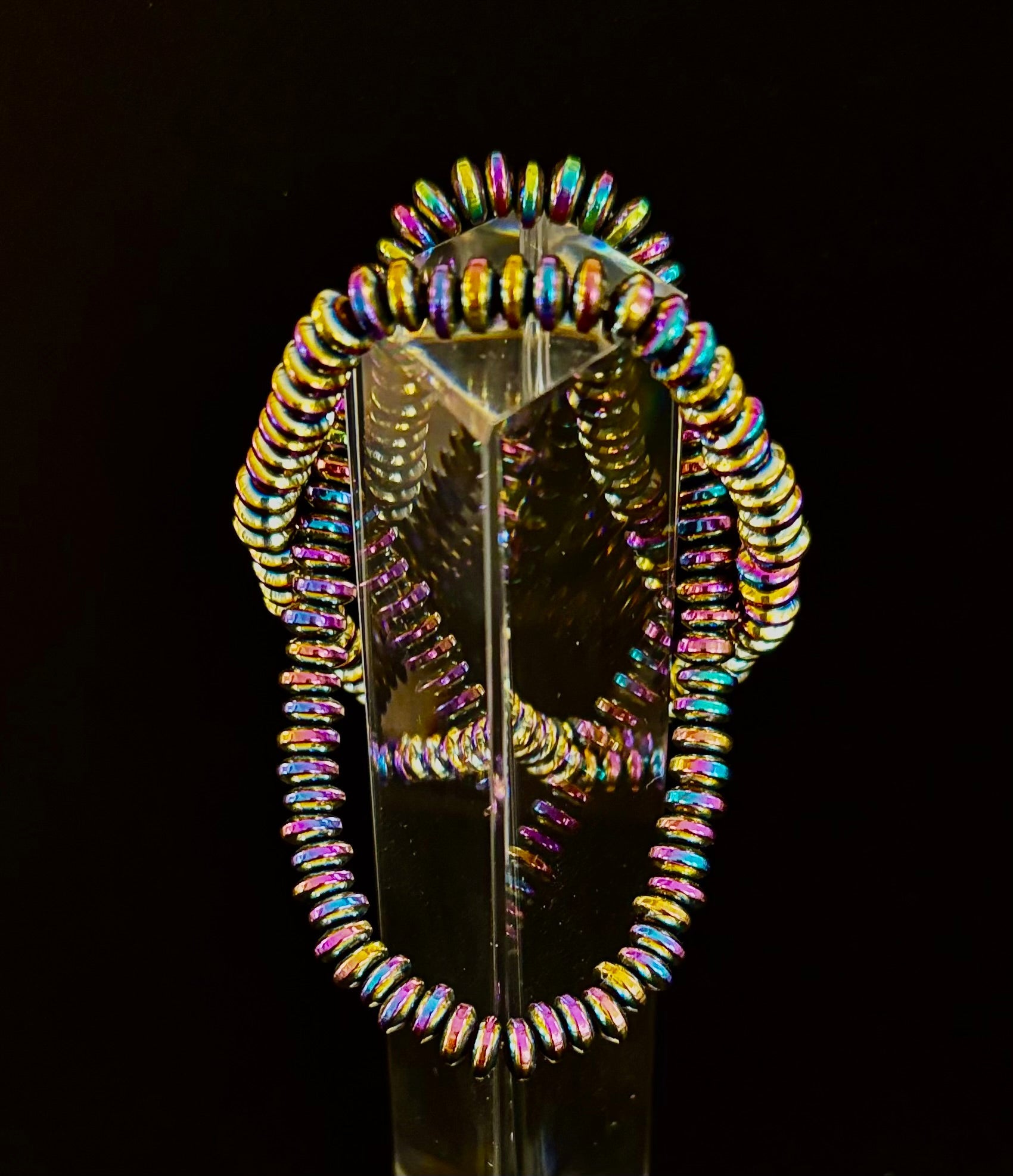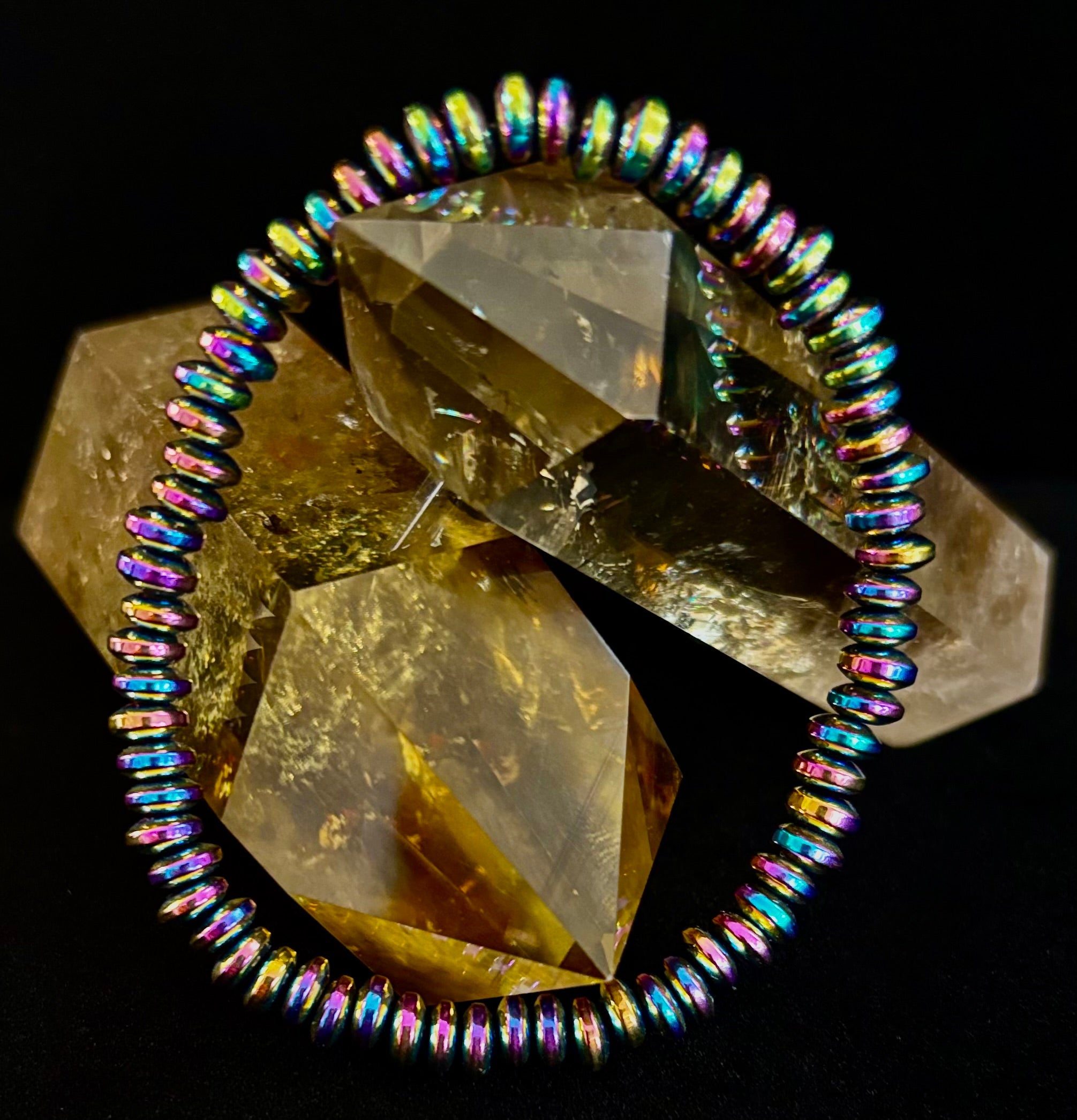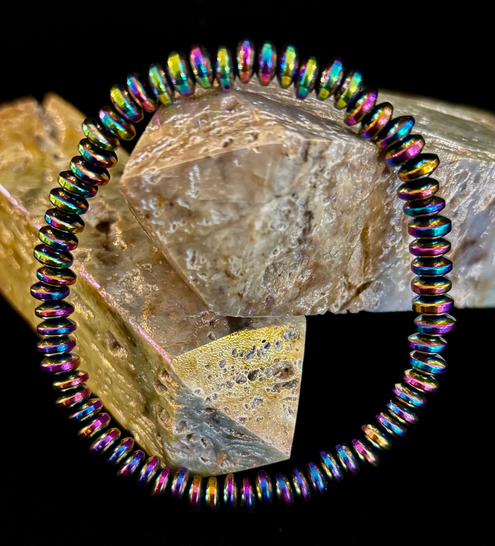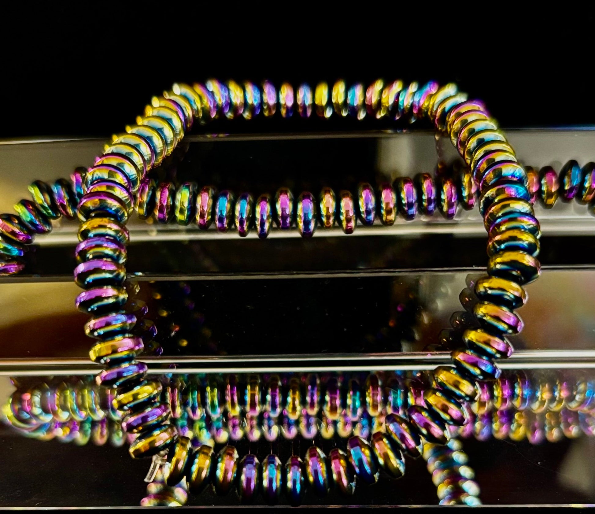 Add effortless style to your look with this sleek Rainbow Hue Metal Bracelet, designed for medium to large wrists. Crafted with metallic rondelle beads that shimmer in a spectrum of rainbow colors, this bracelet offers a bold yet versatile statement.