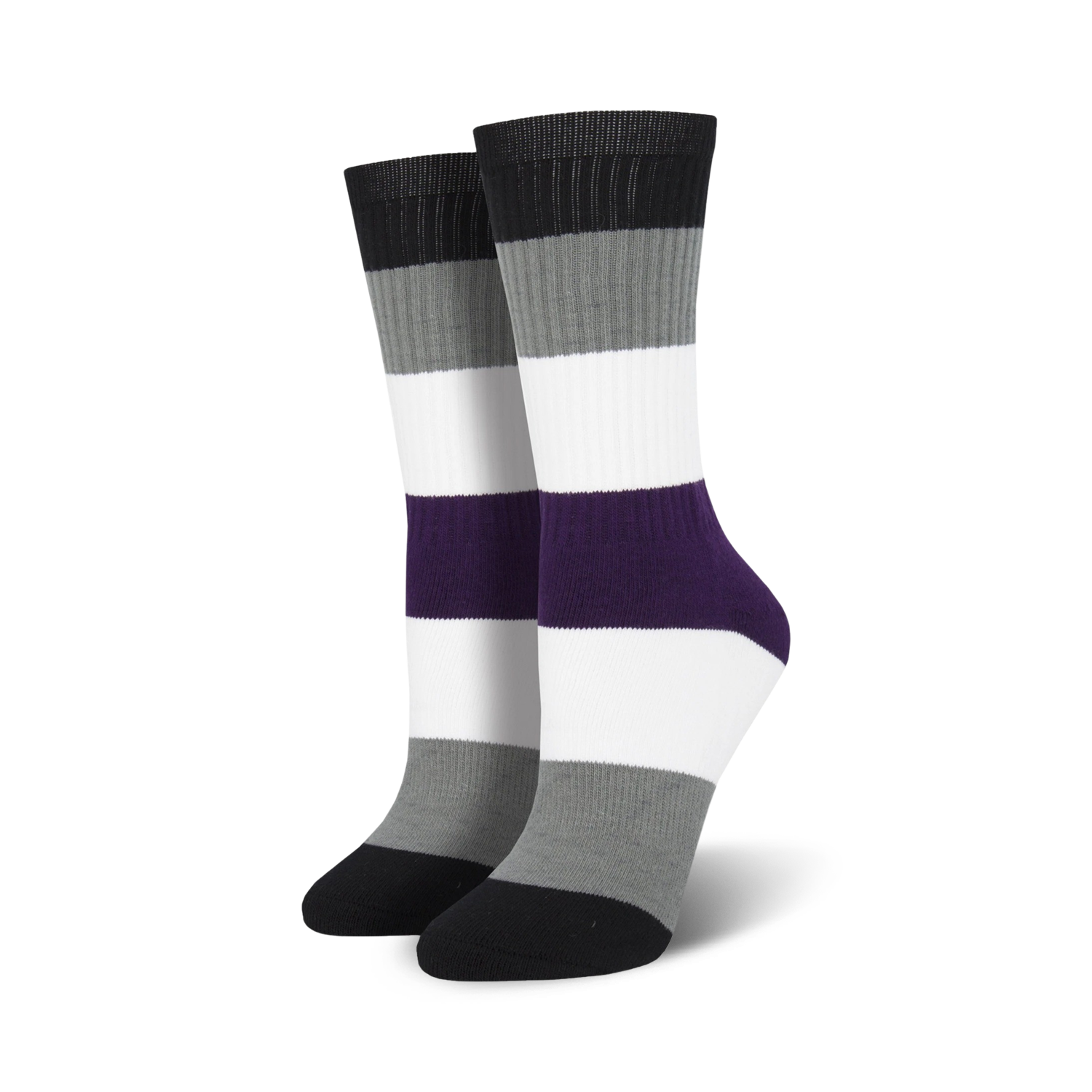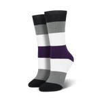 You'll be the ace of the party with these colorful socks featuring four stripes in black, grey, purple, and white. Perfect for showing off your pride in style whether you're hanging out with friends or just kicking back at home, these crew length socks are sure to turn heads and make you smile. Plus, they're suitable for both men and women, so everyone can get in on the fun.