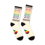 Slip into a pair of Book Nerd Pride socks and let your feet do the talking! These white socks with black toes and heels feature a rainbow-colored pattern of the words "book" and "nerd" knitted into them. The words are arranged in a vertical column on each sock, and the socks have a heart-shaped rainbow on the ankle. Whether you're curling up with a good book or hitting the town, these socks will show the world that you're a book nerd and proud of it!