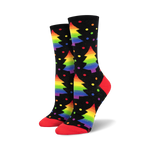 Celebrate the season with the Holiday Pride crew socks! These fun black socks feature a festive pattern of rainbow-colored Christmas trees with colorful polka dots, sure to bring a smile to your face and holiday cheer to your feet.
