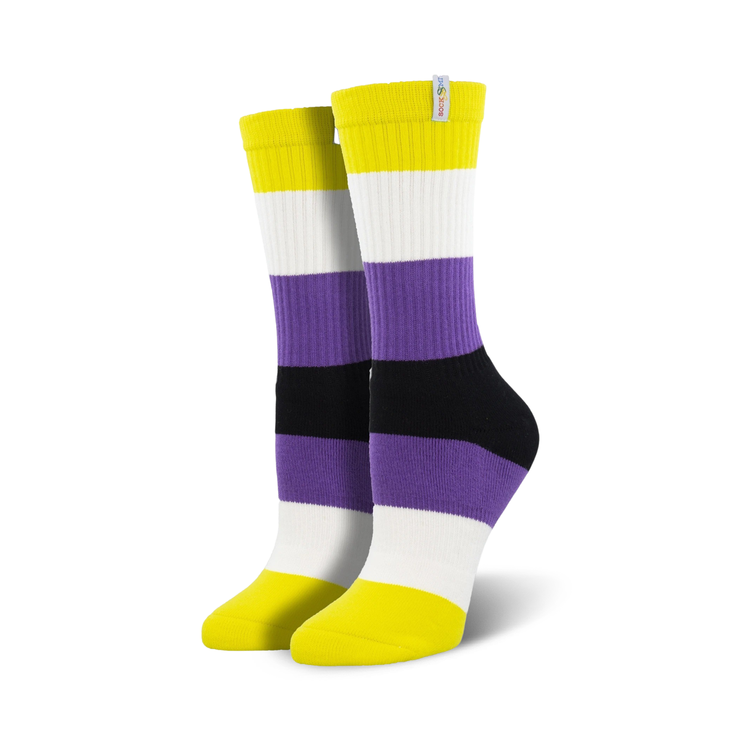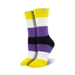 Need a bold, eye-catching sock that celebrates diversity and non-binary expression? Embrace your individuality with our Non-Binary Pride crew socks, radiating with vibrant yellow, white, purple, and black stripes. Like a gender-bending rainbow, these socks are a testament to the beauty of breaking norms. Feel the pride with every stride.