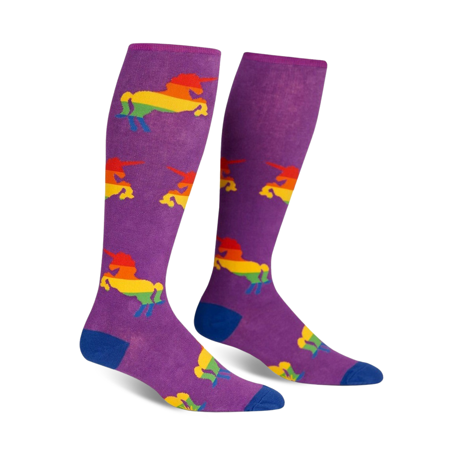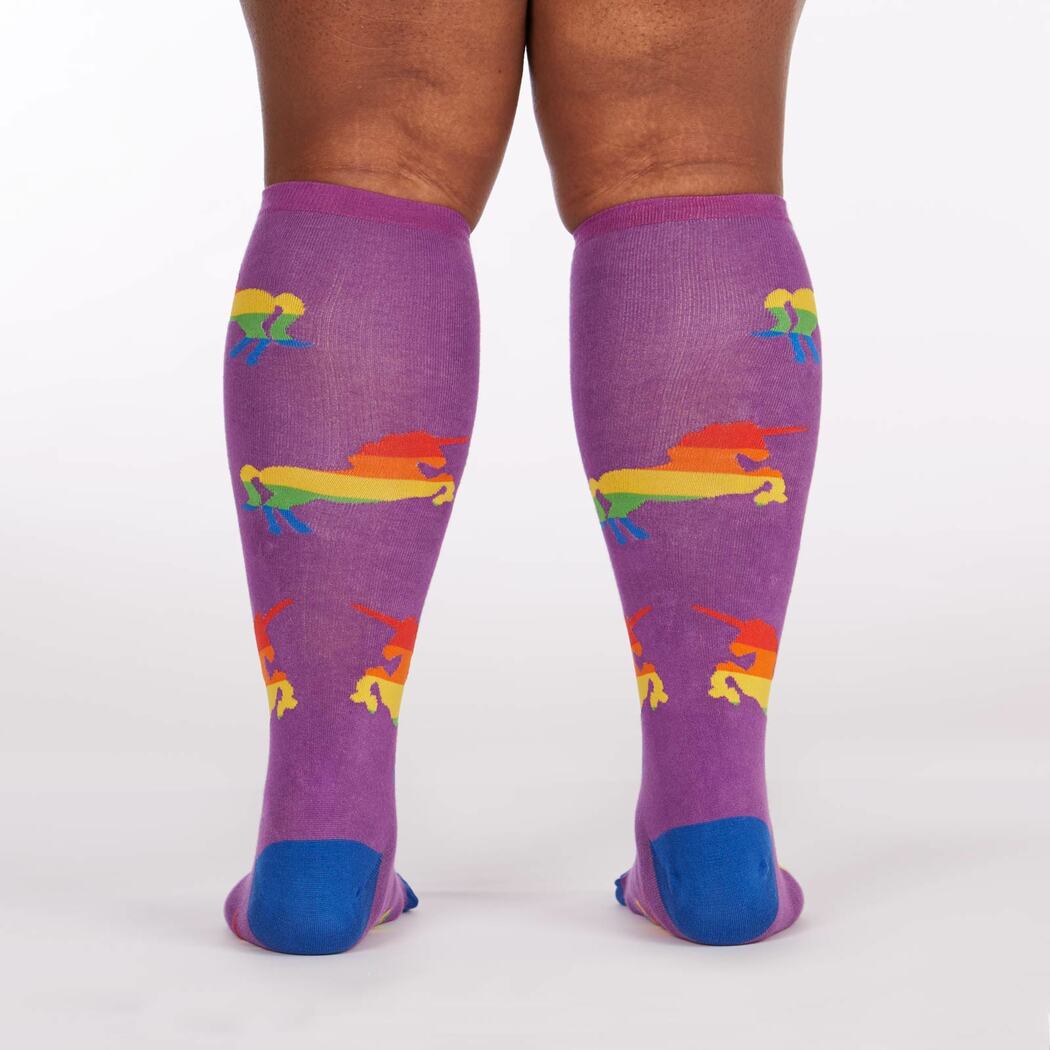 Prepare to have your feet partying with the most fabulous and colorful crew the Pride and Fabulous Unicorn Socks! These knee-high, wide-calf socks are fit for royalty (or anyone who just wants to feel like a majestic unicorn). The purple socks are covered in a pattern of prancing rainbow unicorns with flowing manes and tails they're so magical, you'll want to prance around all day long! Grab a pair today and let your feet experience the magic!