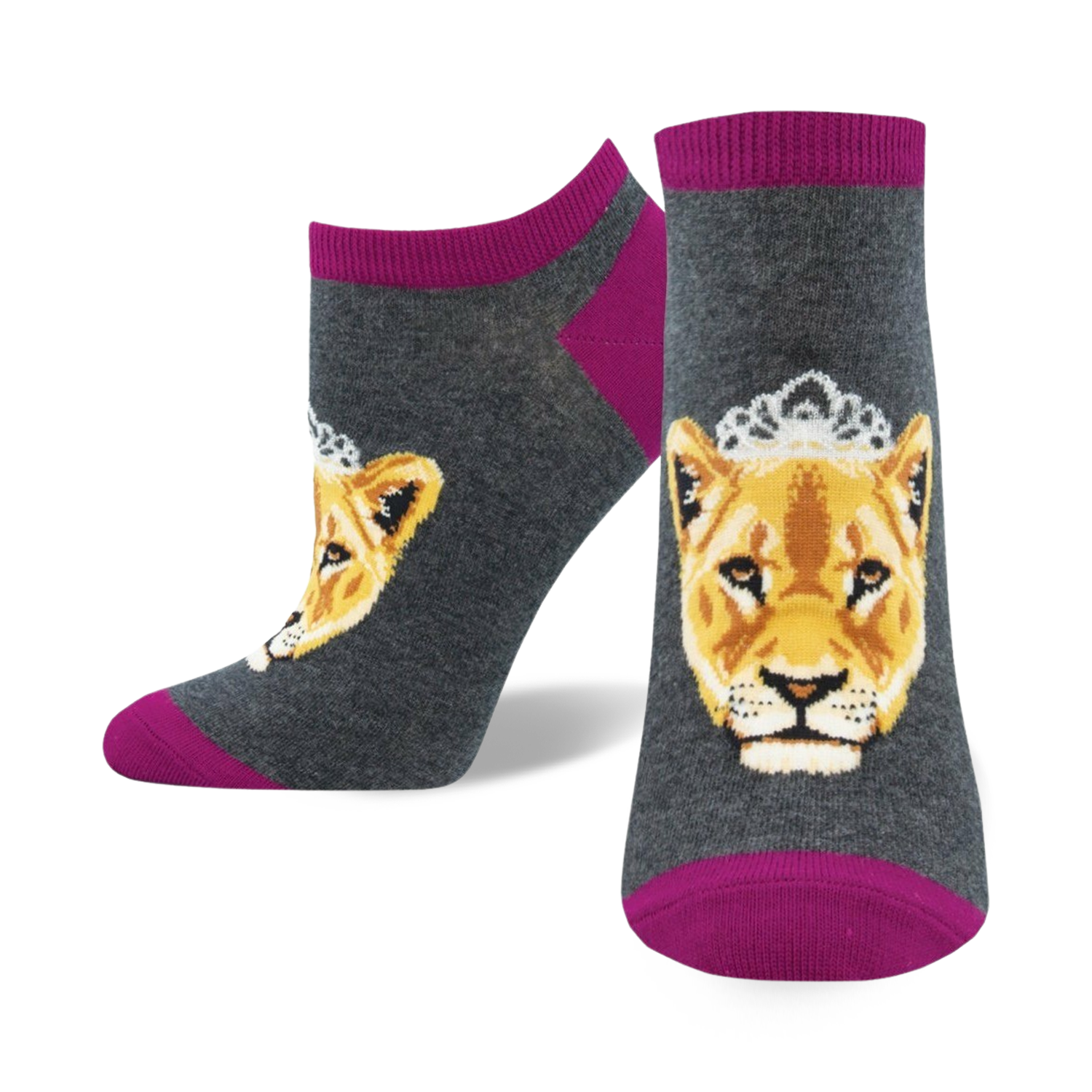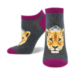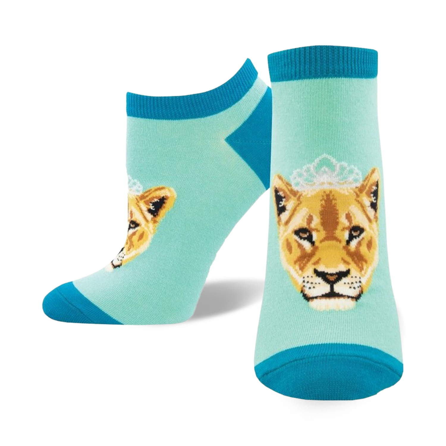 She's the queen of the jungle, the ruler of the pride, and now she's on your feet! These light blue ankle socks feature a pattern of cartoon lioness faces with golden fur, black noses, and blue eyes. They're also wearing golden crowns, because they're royalty, duh! These socks are perfect for any woman who wants to add a little fun and personality to her wardrobe.