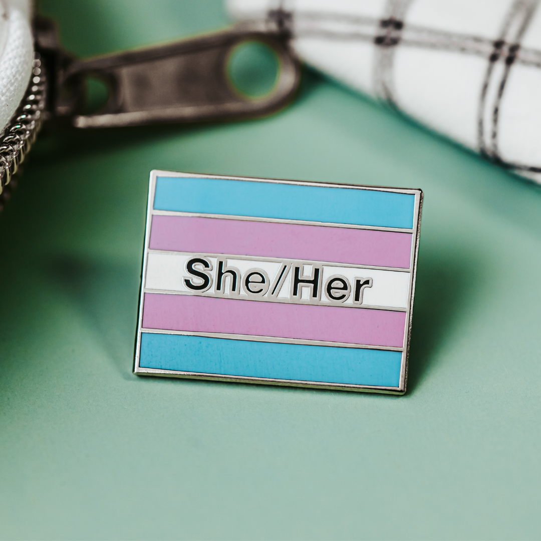 Celebrate identity with every outfit. This 1-inch She/Her enamel pin blends your pronouns with the pastel power of the transgender pride flag. It’s ideal for expressing yourself with confidence—or showing support for trans women and transfeminine folks in your life.