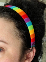 Add a pop of color to your outfit with a colorful headband. Soft and comfortable cotton, this headband is perfect for keeping your hair in place while also adding a touch of rainbow fun. (approx. 1 inch wide, sized for adults and teens)
