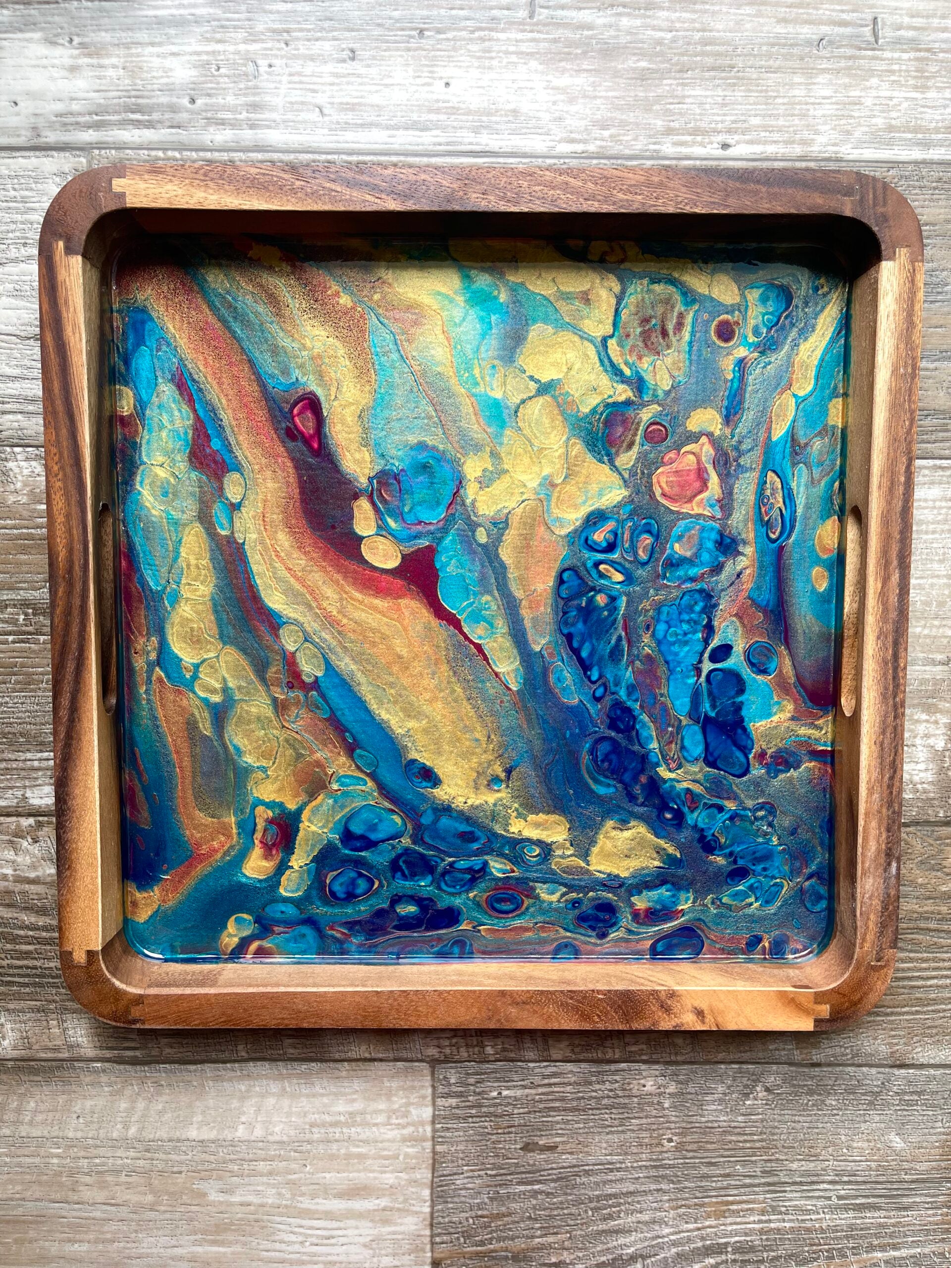 Square acacia wood tray (14" x 14"), featuring two handles and sealed with your choice of sparkly or non-sparkly UV-resistant, high-gloss epoxy resin. The FDA compliant food-safe resin will withstand heat up to 135 degrees Fahrenheit (safe for a cup of coffee or a hot plate, but not a hot pan from the oven).