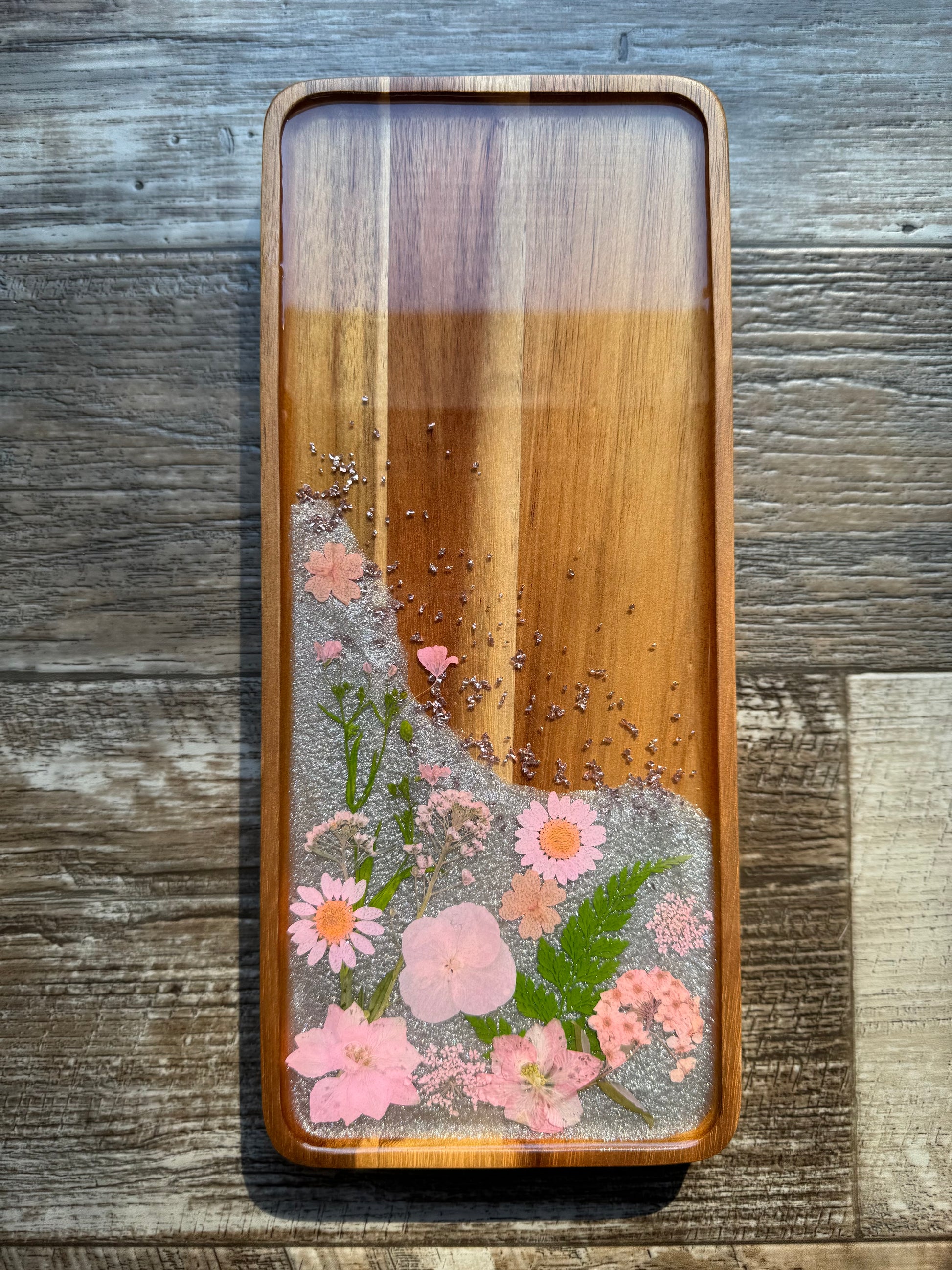 Each acacia wood tray (11.75" x 5") features recessed handles and a colorful dried flower arrangement with shimmery resin background, sealed with UV-resistant, high-gloss epoxy resin. The FDA complaint food-safe resin will withstand heat up to 135 degrees Fahrenheit (safe for a cup of coffee or a hot plate, but not a hot pan from the oven).