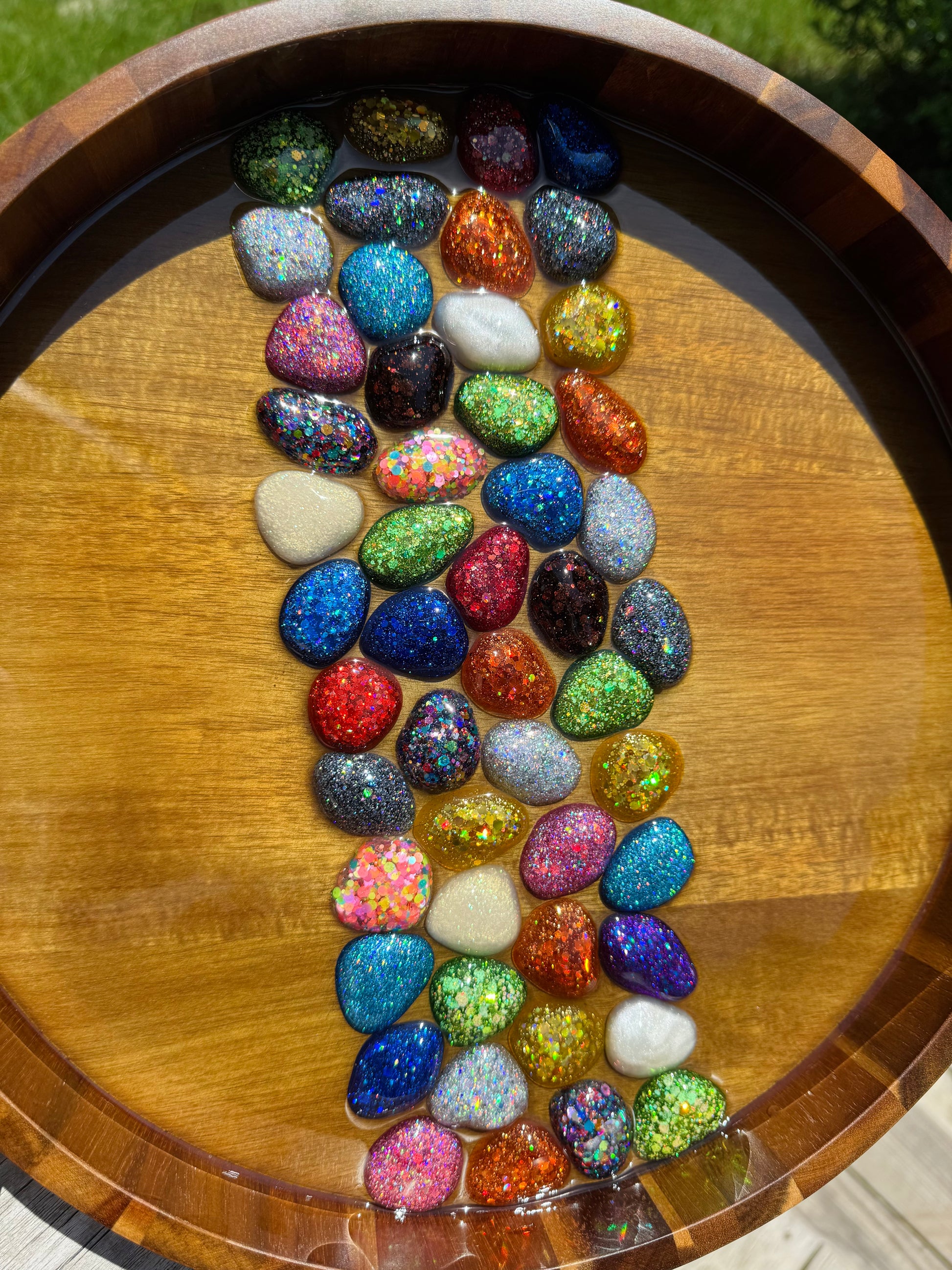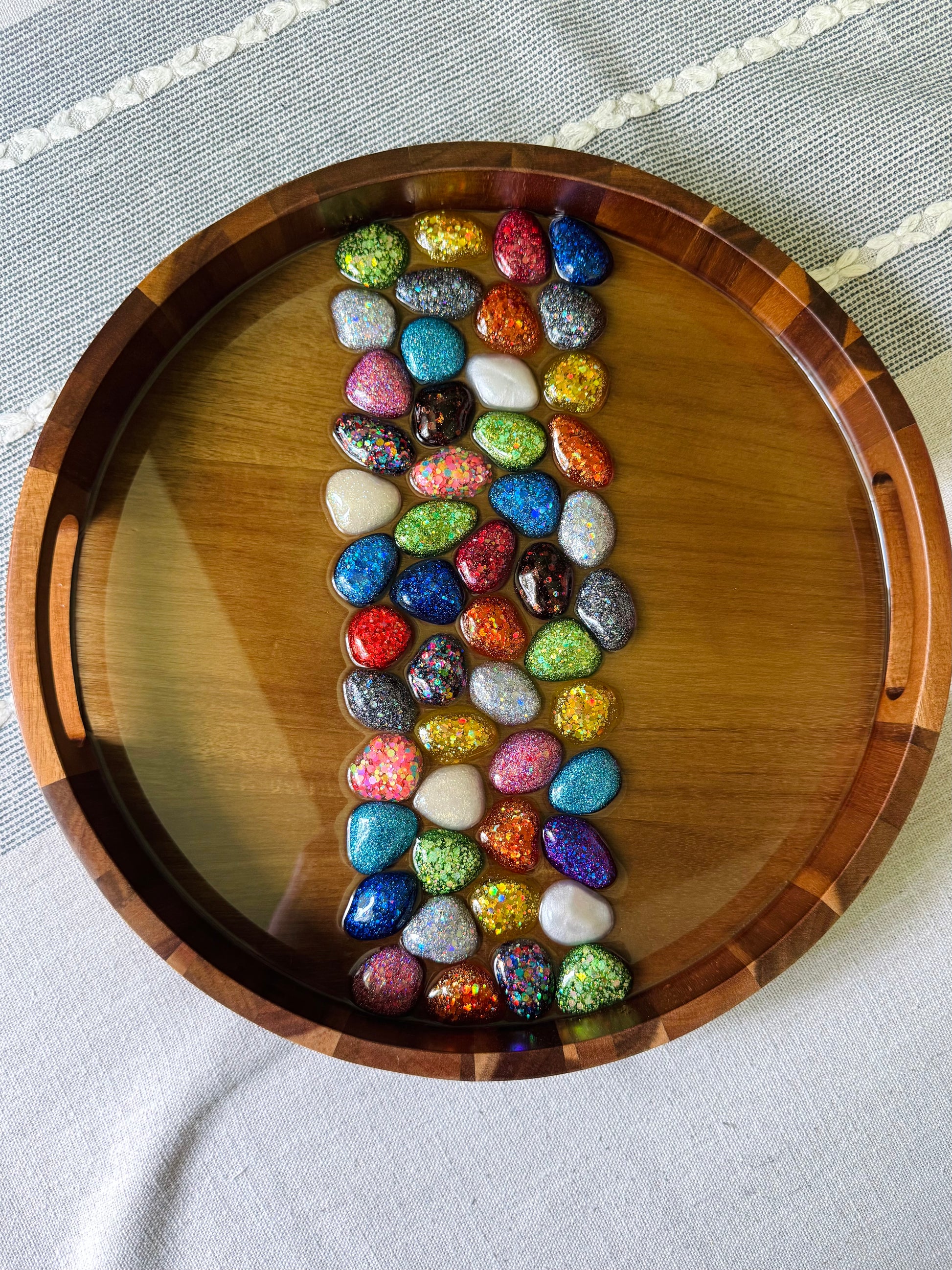 Glittery Rainbow Pebbles Medium Round Acacia Wood Tray