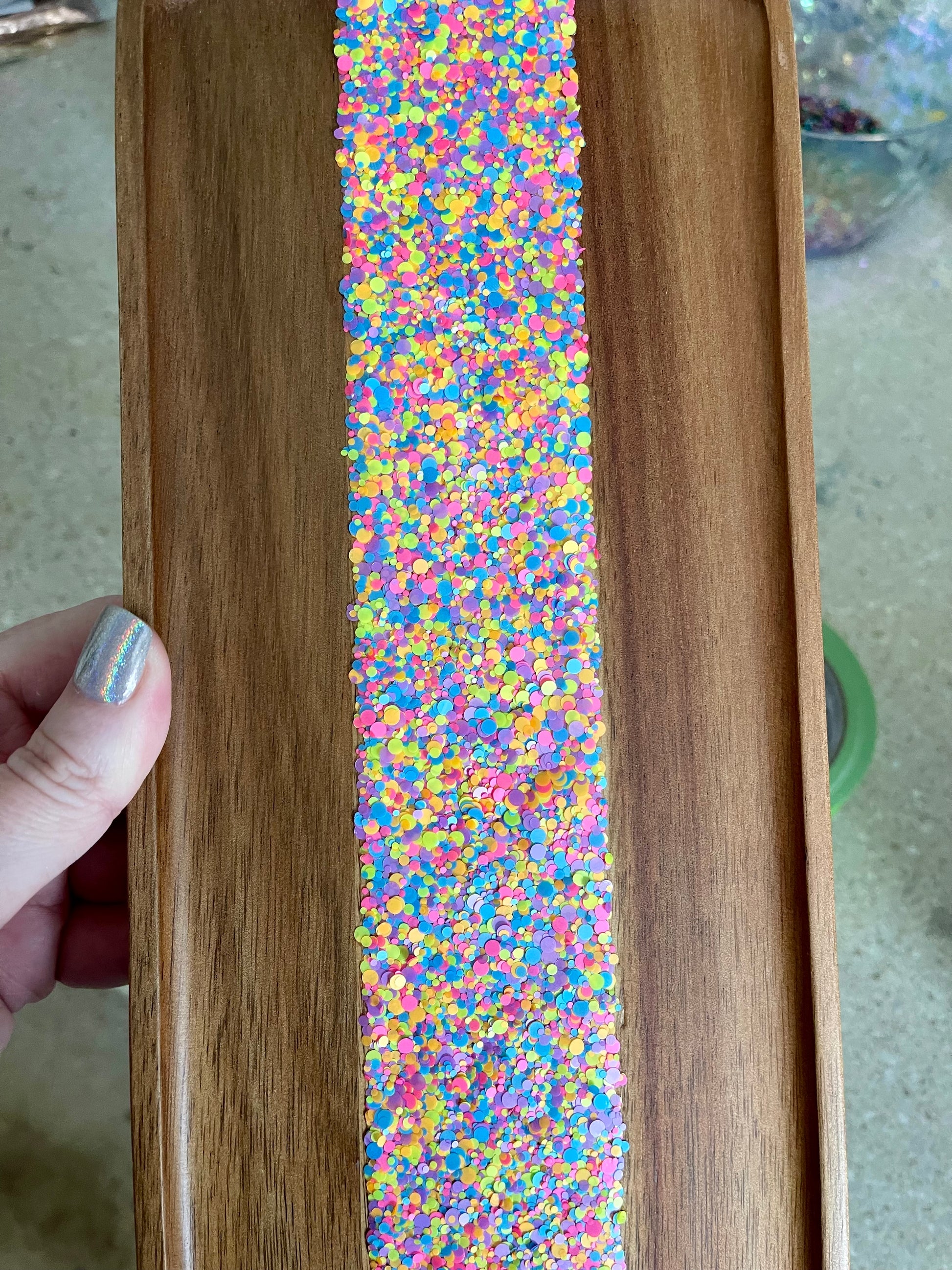 All Glitterwhore collection trays are made to order and may not ship immediately. It will take 5-7 business days for me to complete your order. Videos and/or pictures are for example purposes only. Each tray is unique and one of a kind, pattern and woodgrain will vary.