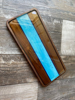 Slightly flawed, but still beautiful/functional acacia wood tray (11.75" x 5"), featuring recessed handles, and a blue/green gradient of color, accented with iridescent, color-shift and chunky glitter and navy blue edge stripes, sealed with UV-resistant, high-gloss epoxy resin. The FDA complaint food-safe resin will withstand heat up to 135 degrees Fahrenheit (safe for a cup of coffee or a hot plate, but not a hot pan from the oven).
