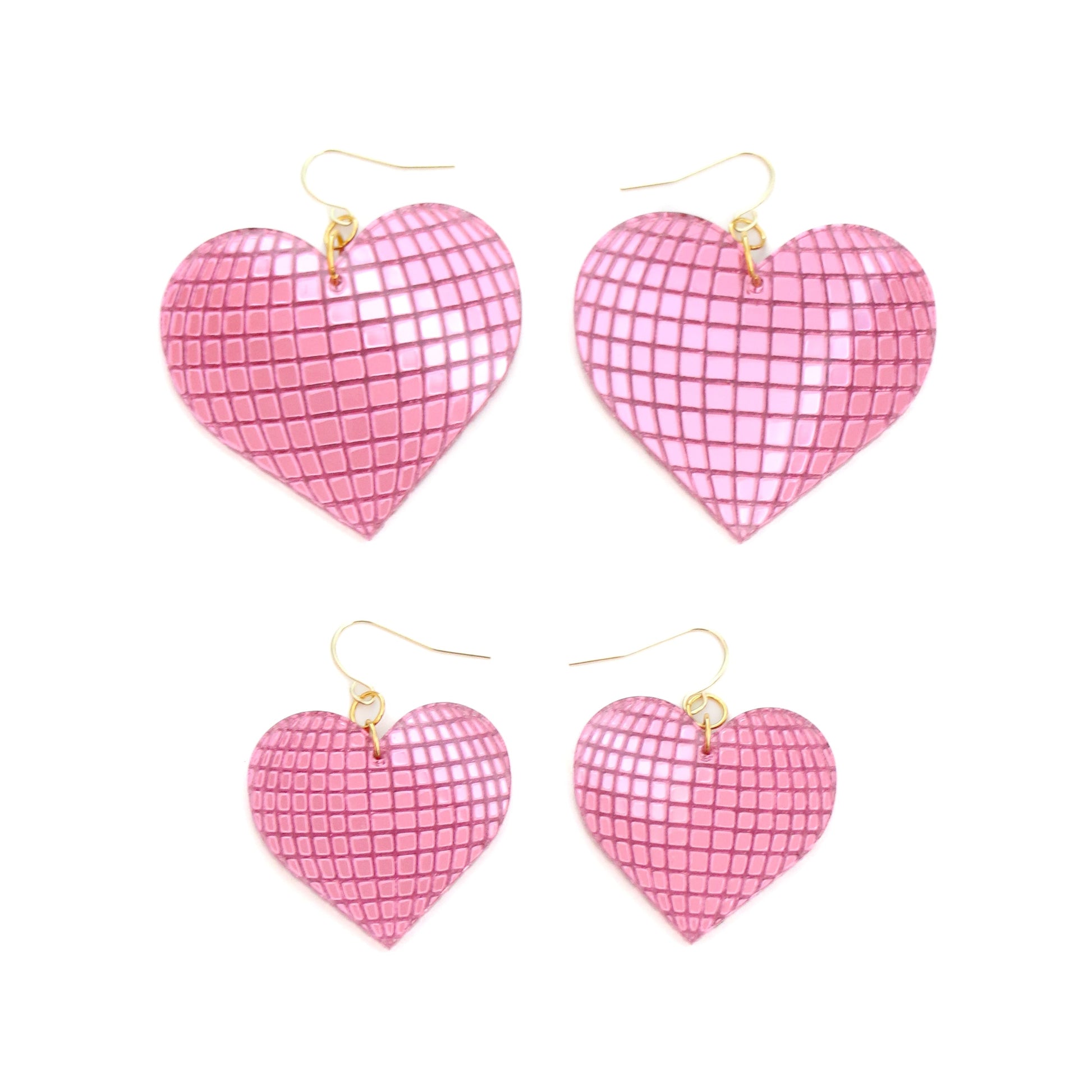 Set of 1 acrylic disco ball heart earrings. Choose from small (1.25") or large (1.75").
