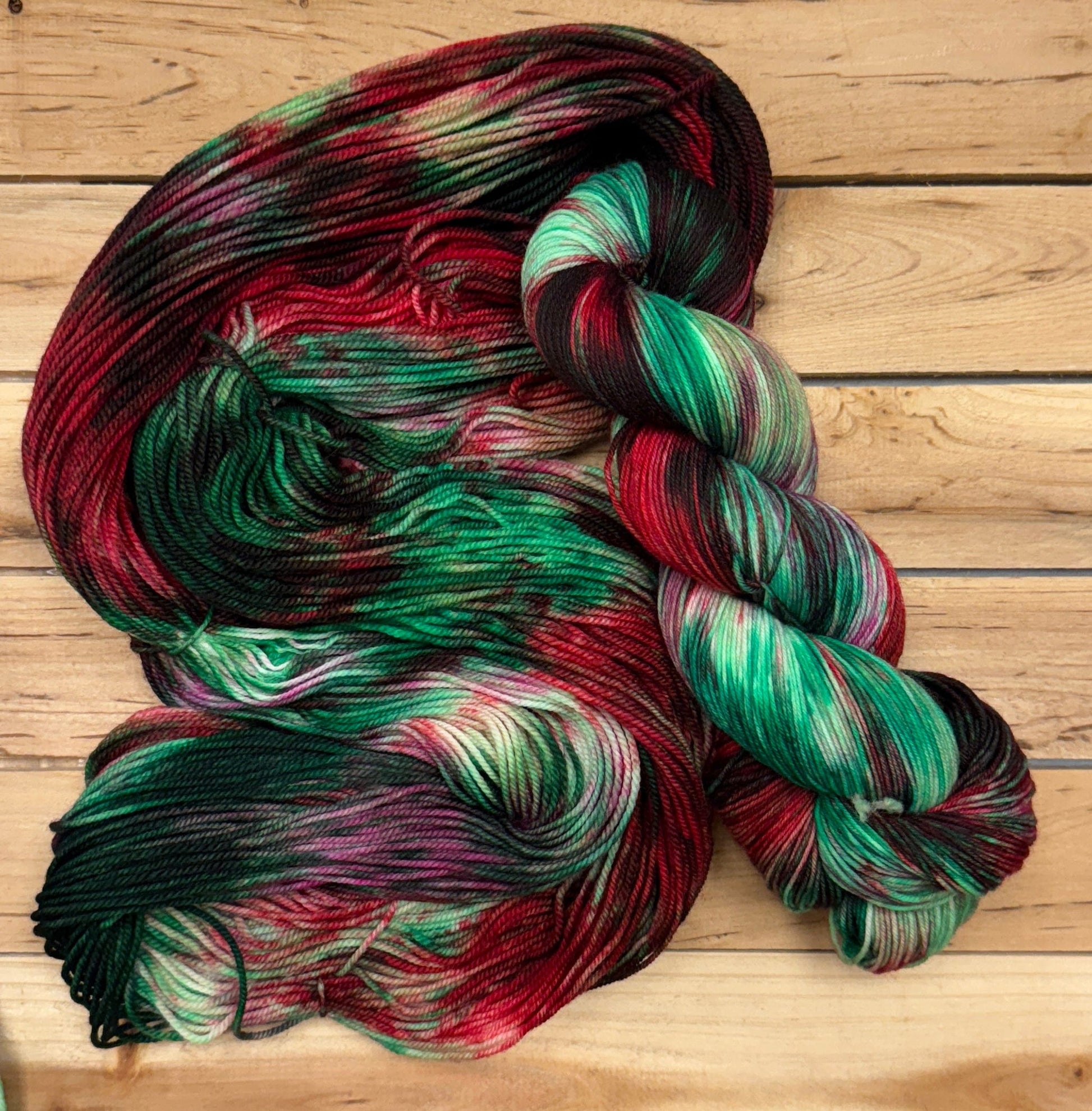 A garden at twilight, wild and untamed — this hand-dyed yarn is a passionate swirl of deep crimson, leafy green, moody black, and whispers of white and cream. Like a midnight rose garden tangled in secrets, Bed of Roses is bursting with bold, romantic energy and a hint of mystery.