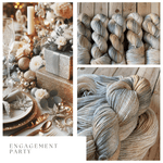 Engagement Party is an elegant, celebratory colorway featuring subtle washes of soft gold, pale champagne, and cool slate over a creamy neutral base. The palette evokes the sparkle of toasts and the warmth of candlelight—perfect for sophisticated knits with a delicate touch.