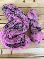 Love Potion #9 is a bold magenta pink splashed with inky black speckles—sweet with a little bite. It works up into lively, high-contrast fabric that’s perfect for socks, hats, shawls, and statement sweaters.