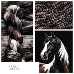 Paint Horse is a bold, western-inspired colorway featuring deep chocolate brown, inky black, and creamy white. Designed to mimic the striking coat patterns of its namesake, this yarn brings strong contrast and natural drama to any project.