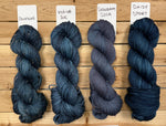 A deep, moody blue with shifting undertones of purple, slate, and shadowed teal. Shapeshifter reveals its true colors differently on each yarn base—richer and darker on plumper fibers, softer and hazier on smoother ones. It’s the kind of color that keeps you looking twice.