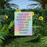 A vibrant yard sign that pops with color and positivity. Printed on sturdy 4mm corrugated plastic with a matte finish, this double-sided sign displays bold lettering and a lively, marbled background that reads “MAKE KINDNESS GREAT AGAIN.” It arrives with a lightweight aluminum stake for easy installation in lawns or garden beds, and you can choose portrait or landscape orientation and one of three sizes to suit your space. Made and printed in the USA, it’s built to withstand outdoor display while keeping its bright, joyful look.