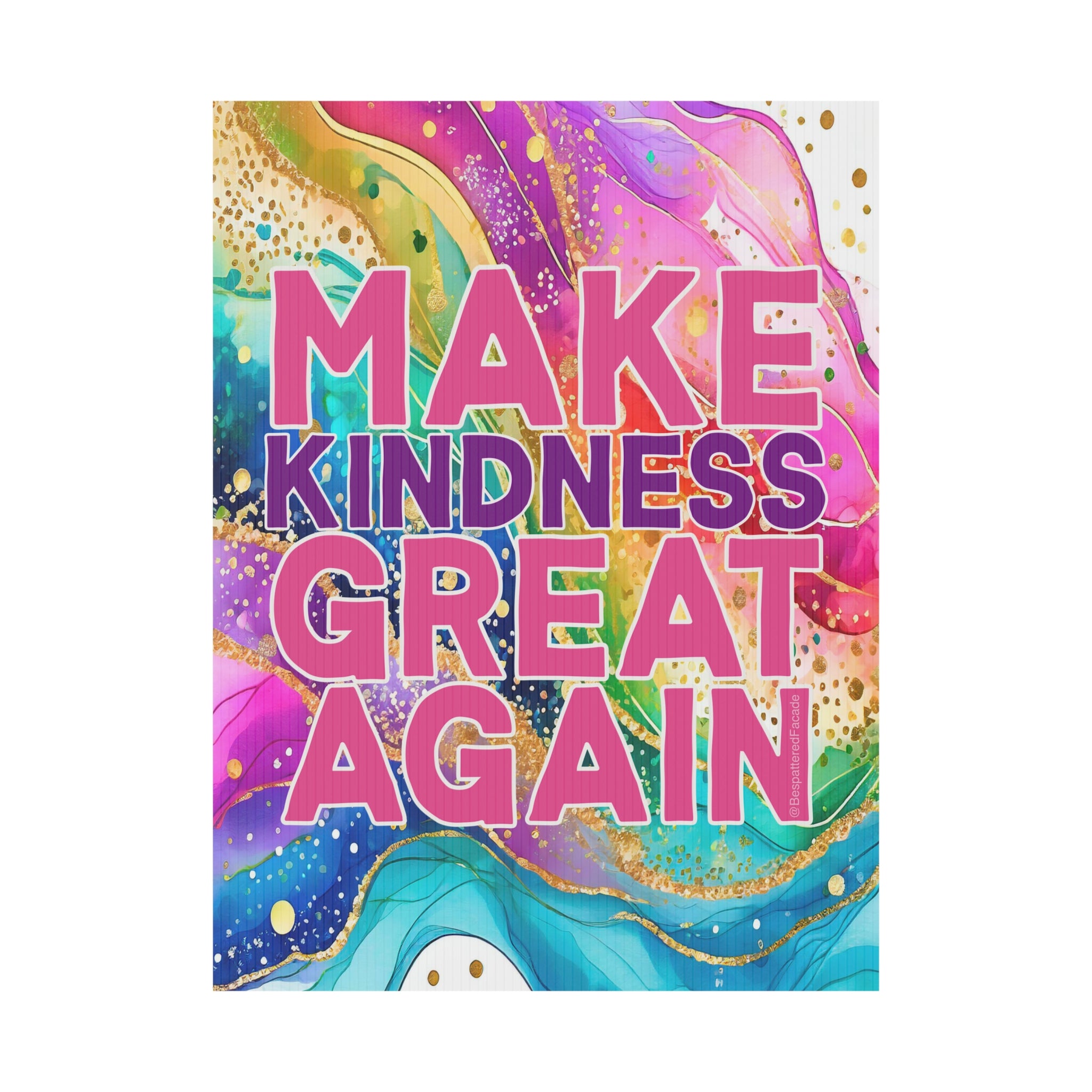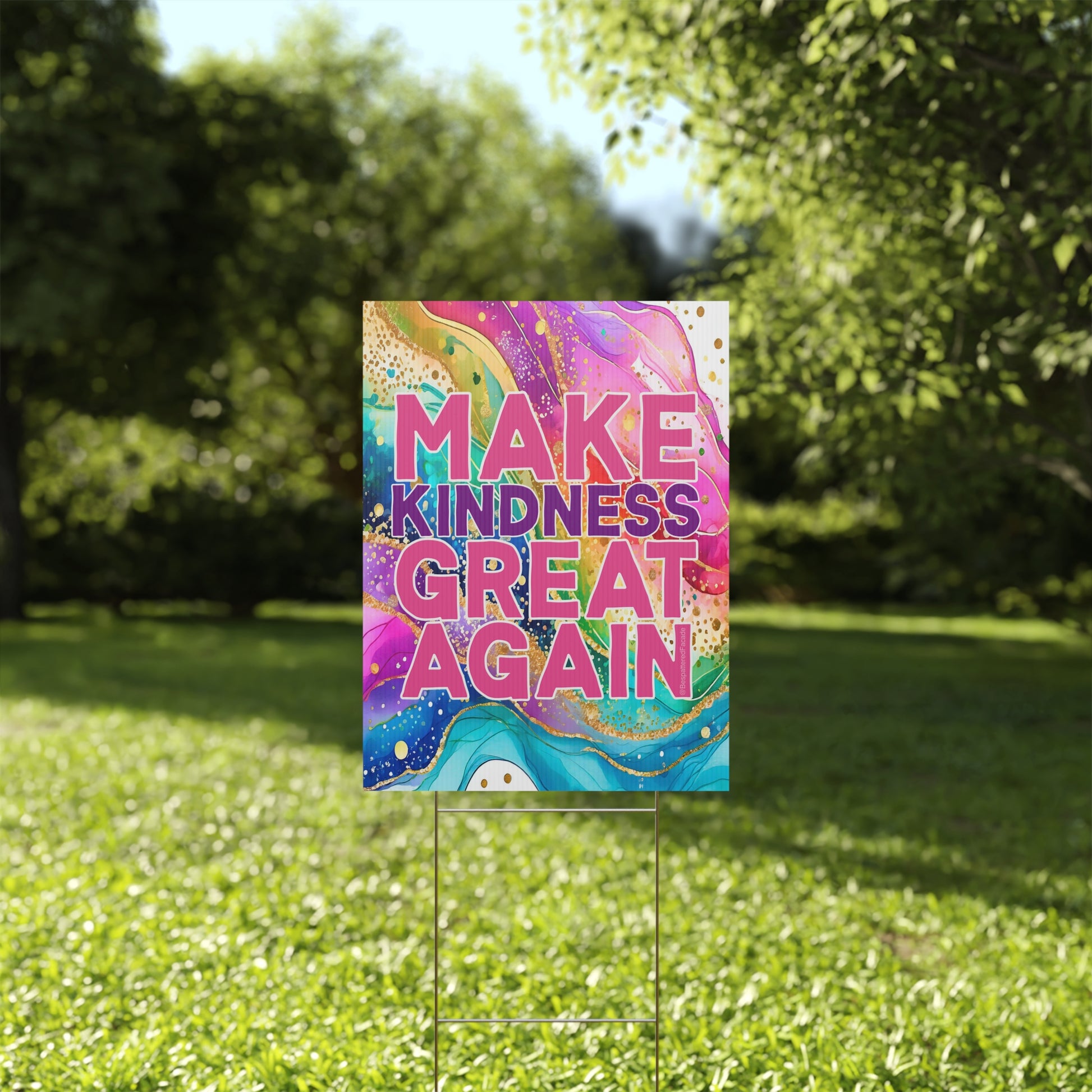 A vibrant yard sign that pops with color and positivity. Printed on sturdy 4mm corrugated plastic with a matte finish, this double-sided sign displays bold lettering and a lively, marbled background that reads “MAKE KINDNESS GREAT AGAIN.” It arrives with a lightweight aluminum stake for easy installation in lawns or garden beds, and you can choose portrait or landscape orientation and one of three sizes to suit your space. Made and printed in the USA, it’s built to withstand outdoor display while keeping its bright, joyful look.