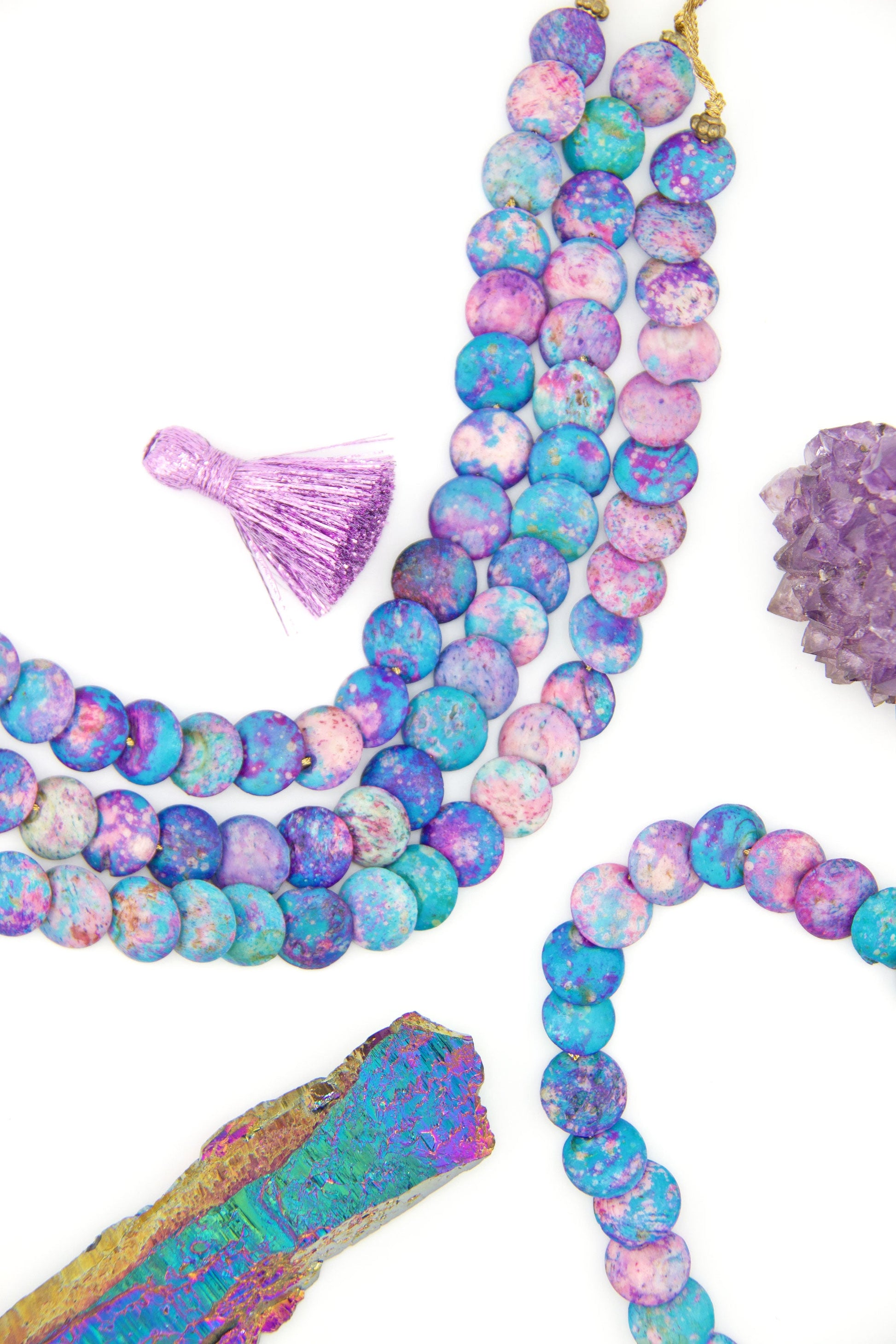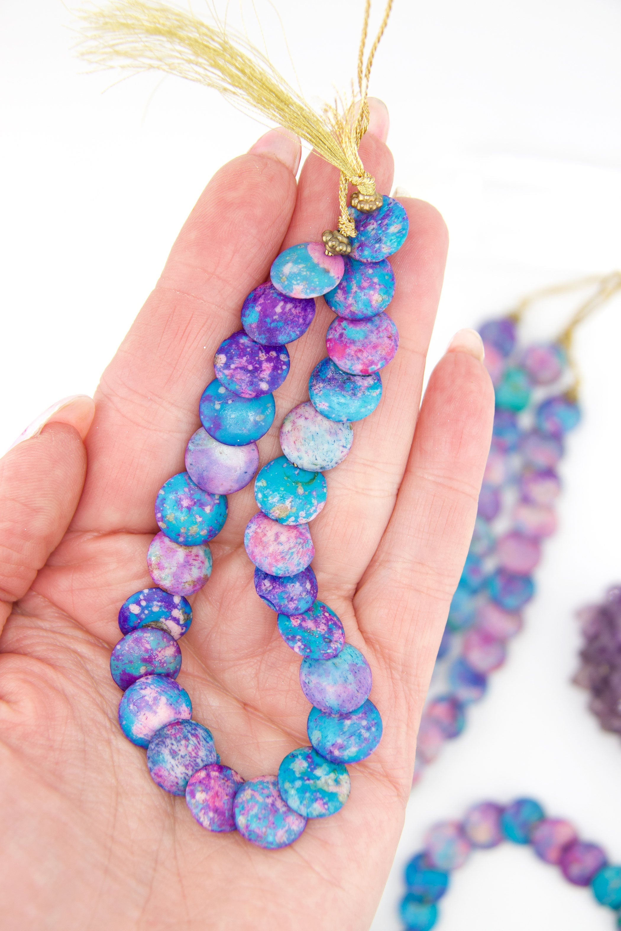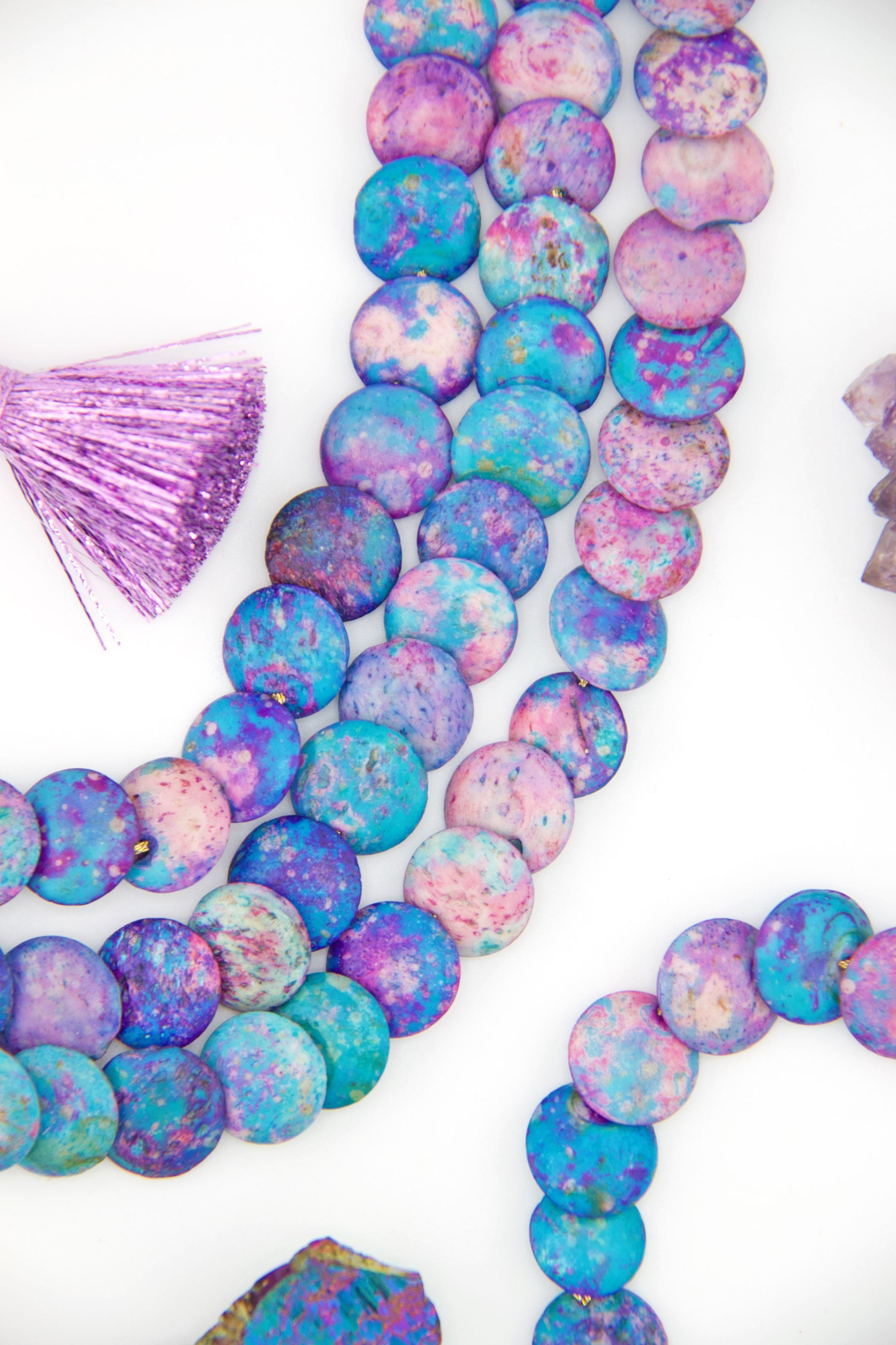 Dive into the ethereal beauty of the night sky with our Aurora Borealis Inspired Bead Collection.  Beautifully textured, these beads remind us of dyeing easter eggs and ice dye tie dye, as much as they do the Aurora Borealis. Rich shades of turquoise and purple swirl together on the surface of these coin-shaped beads.