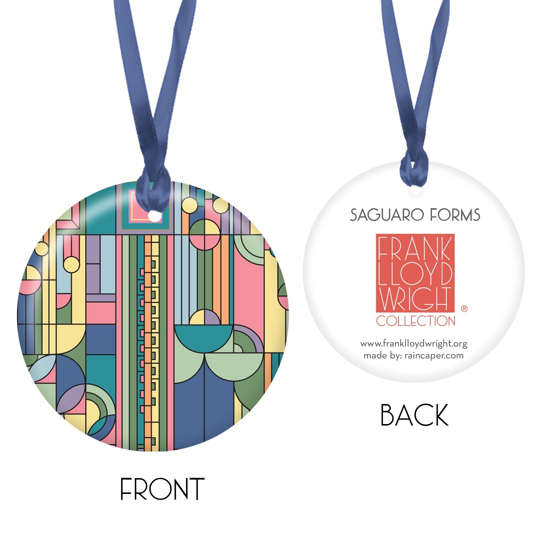 Accent your home with this captivating porcelain keepsake ornament. Our keepsake ornament collection features a series of fine art designs. Beautiful displayed individually or as a group. Experience the artistic brilliance of Frank Lloyd Wright beyond his architectural masterpieces. Explore the intricate world of his drawings, designs, and illustrations that are both functional and artistic. Wright's unique artistic vision, characterized by geometric precision and organic inspiration, is a testament to his creative genius. Discover the beauty of Frank Lloyd Wright's artworks and bring the spirit of innovation and aesthetics into your space. Immerse yourself in the artistic world of this American architectural visionary! The "Saguaro Forms" ornament adds a touch of grandeur to any room.