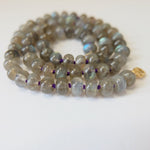 Our labradorite candy necklace shows blue-gray colors with hints of green, yellow, gold, violet, and sometimes orange. This unique stone is a type of feldspar mineral found mainly in Madagascar. It is the only gemstone that shows a beautiful glow called labradorescence. This iridescent glow happens when light reflects off internal planes in the stone. This necklace features 8mm faceted labradorite beads. They are individually knotted on custom-dyed purple thread. This adds extra dimension and contrast. Finished with a 14K yellow gold-filled clasp inspired by the Azores Collection, it’s a piece that balances polish and soul.