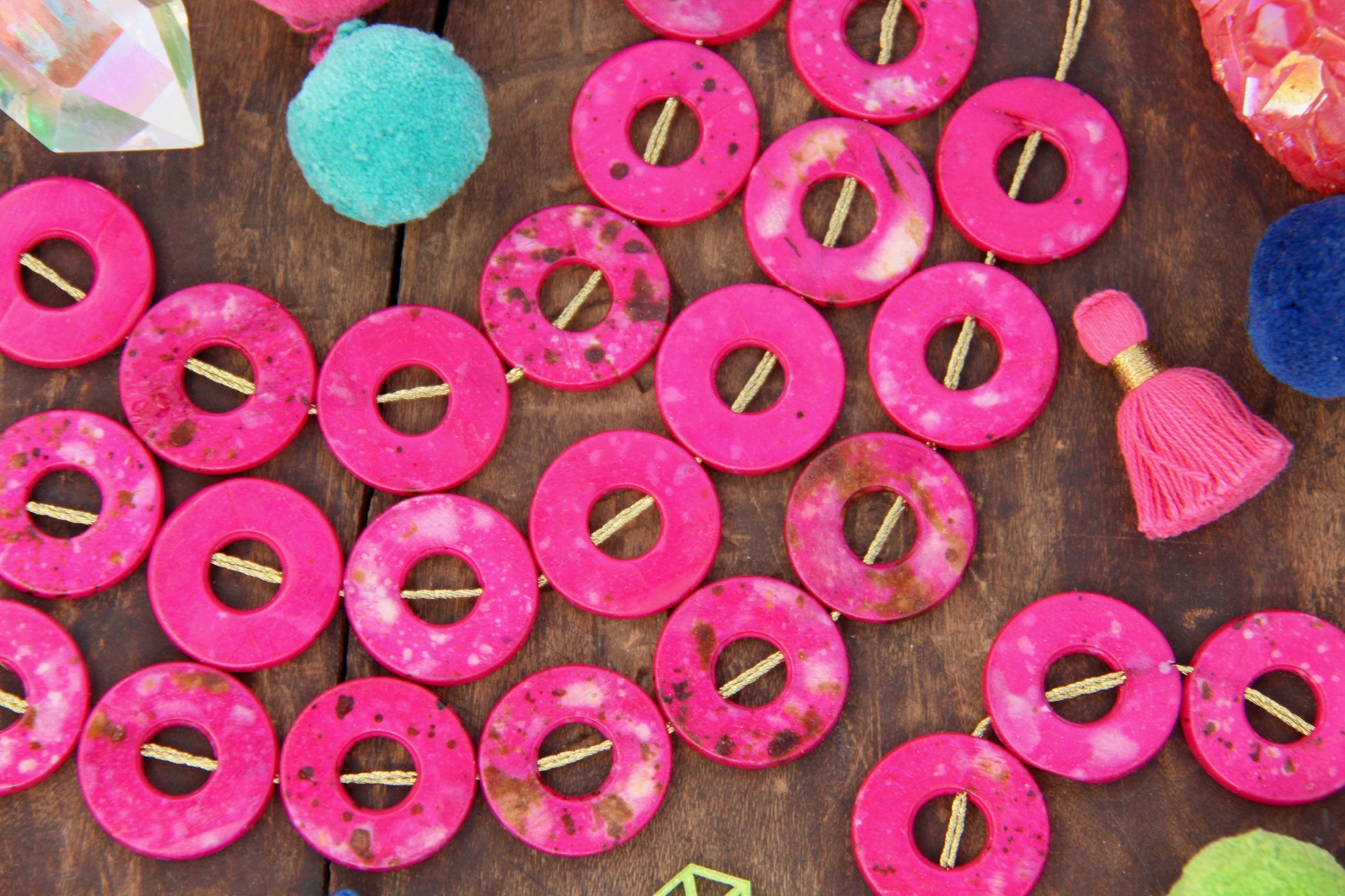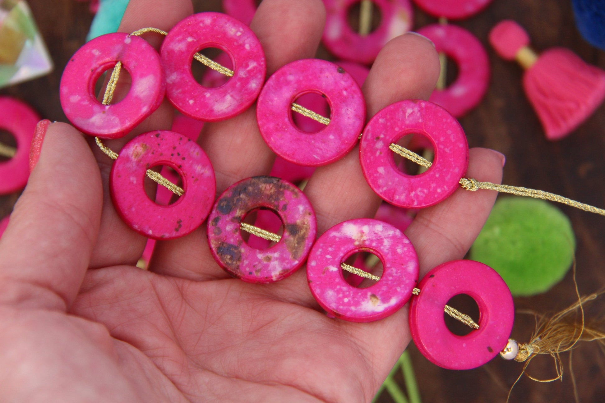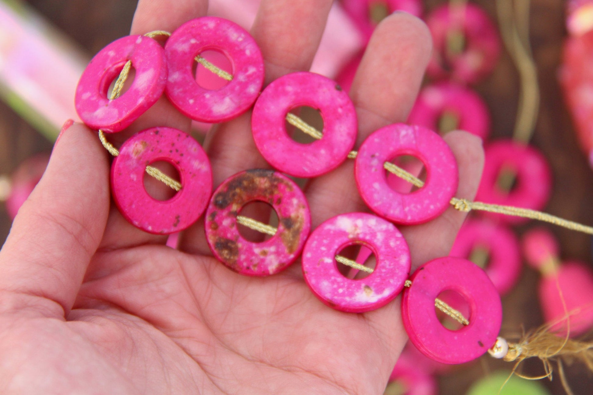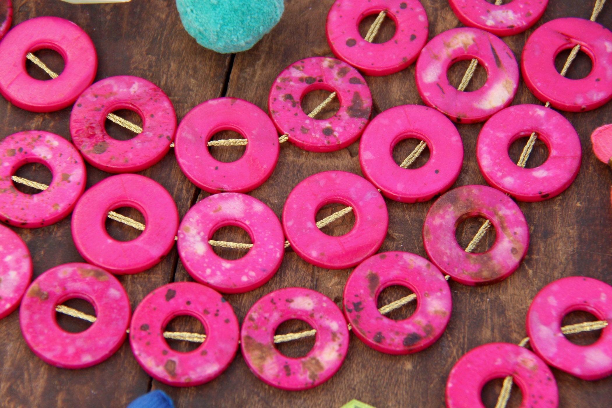 These magenta donut beads are made in India, from cow bone (cruelty-free) that has been stained magenta with brown & white splatters.