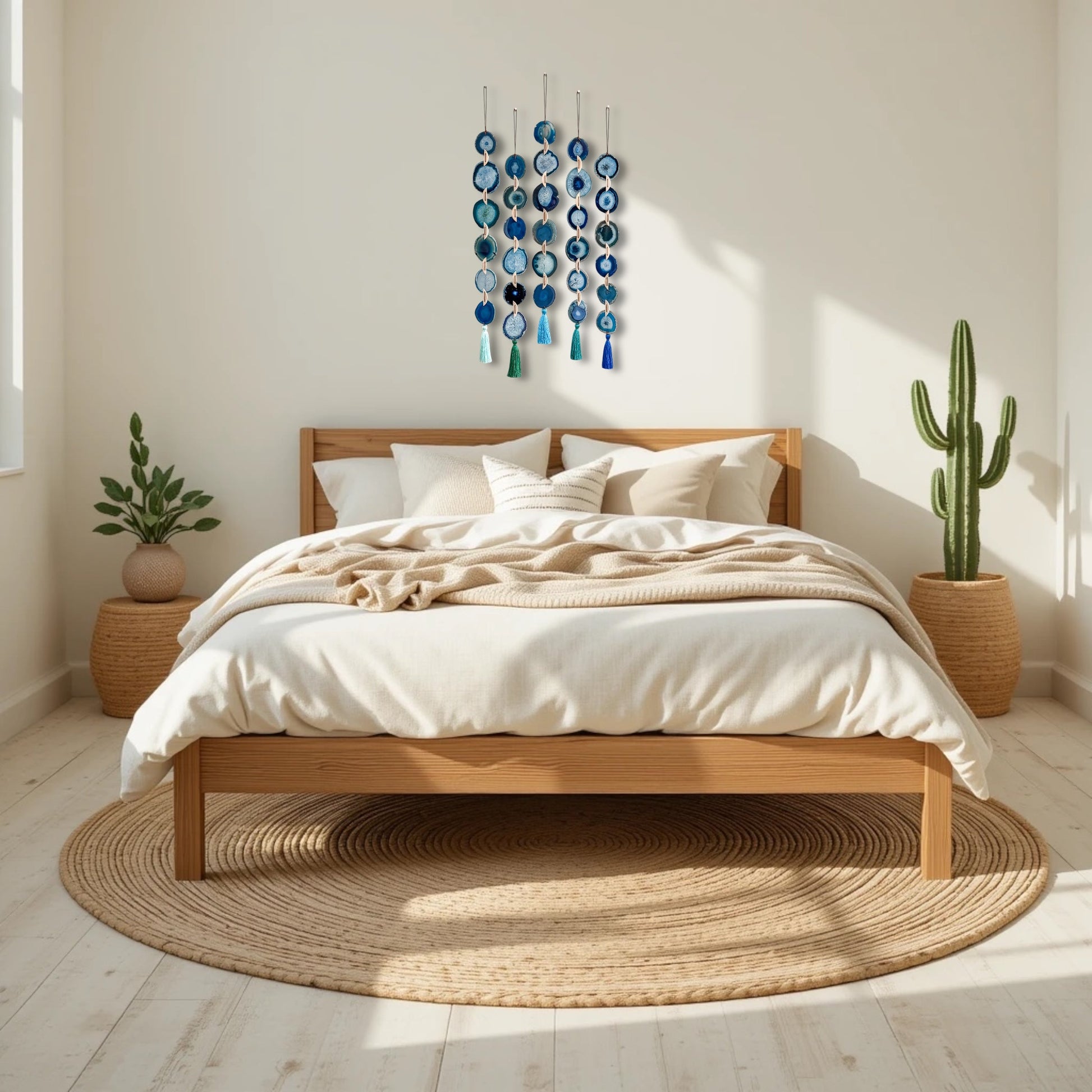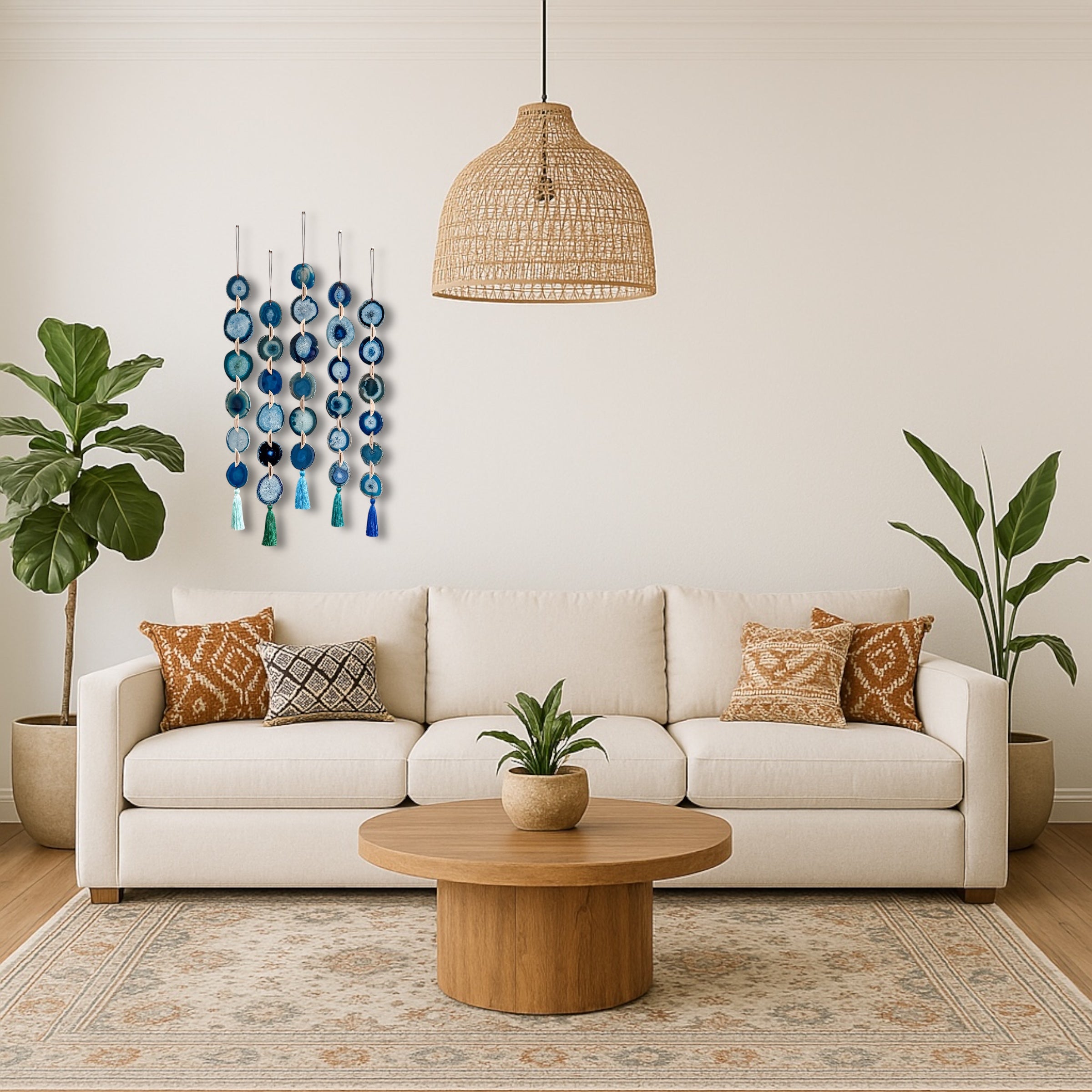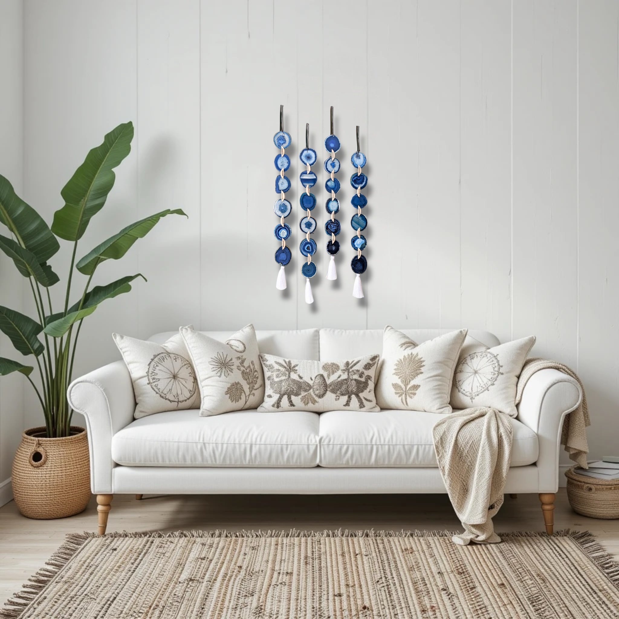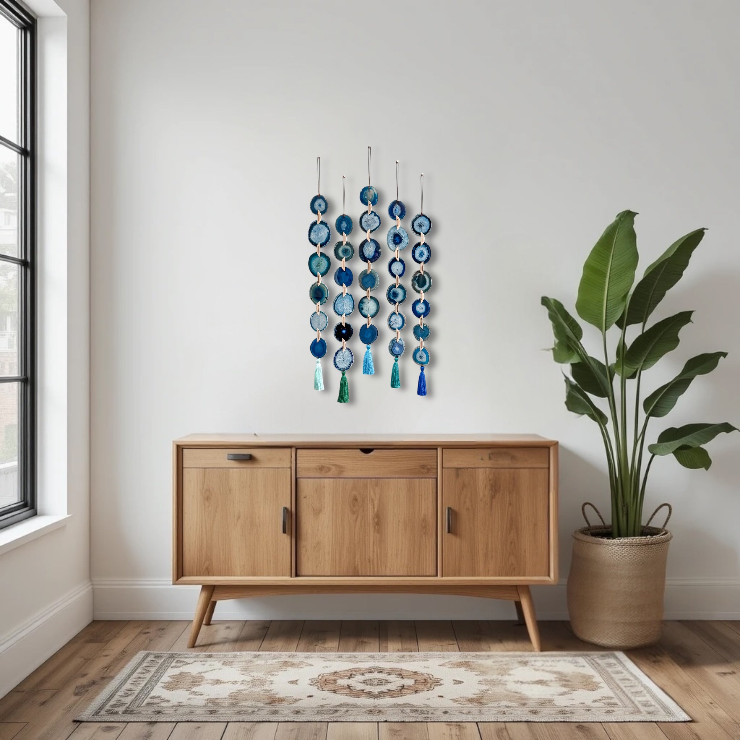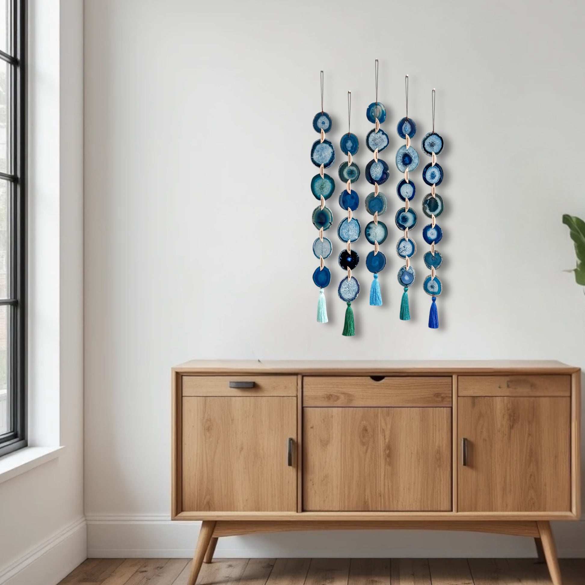 Inspired by the mystical beauty of the ocean, the Ocean Agate Garland Wall Hanging brings the calming energy of the sea into your home. This handcrafted wall hanging features genuine Brazilian agate slices in stunning oceanic hues—ranging from deep blues and teals to foamy aquas and sea greens. Suspended from a natural wood hanger with leather cording, this piece is a perfect blend of coastal serenity and bohemian elegance.