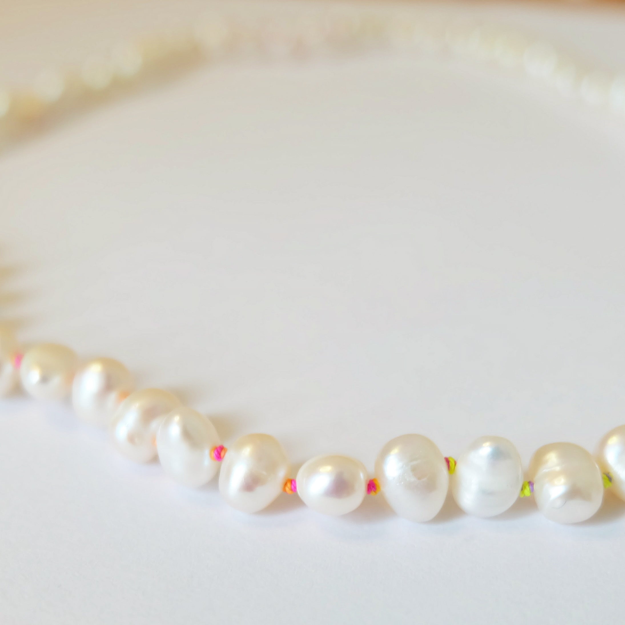 Shop our Pearl Necklace – Knotted on Rainbow Silk combining playful color with timeless elegance. Each freshwater pearl is hand-knotted on custom-dyed silk, creating a piece that’s as joyful as it is refined. Finished with a 14K gold-filled clasp, this necklace offers a modern twist on a classic favorite.