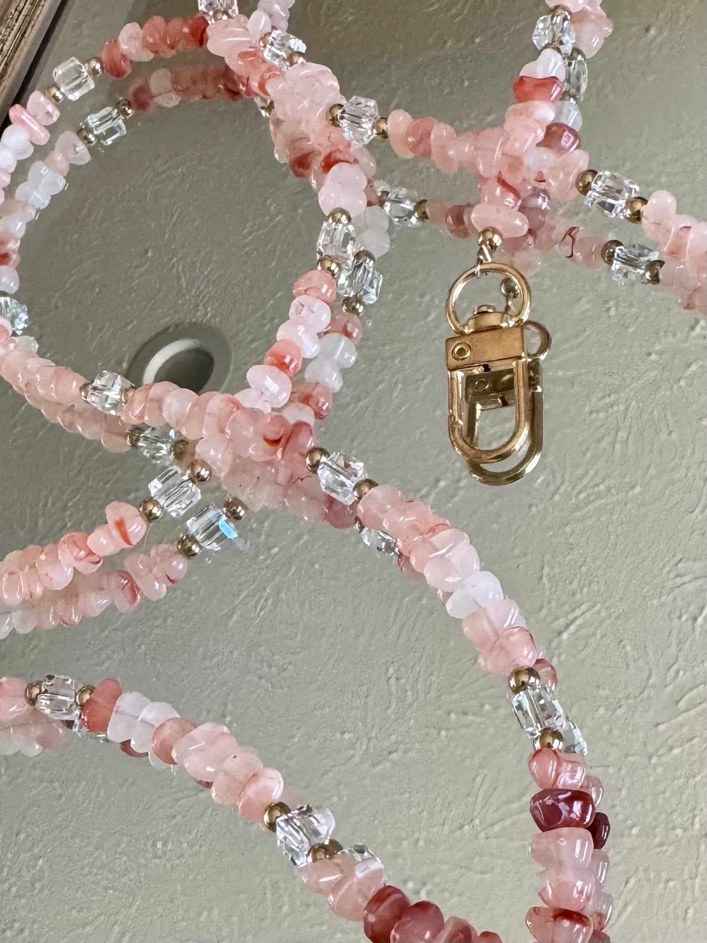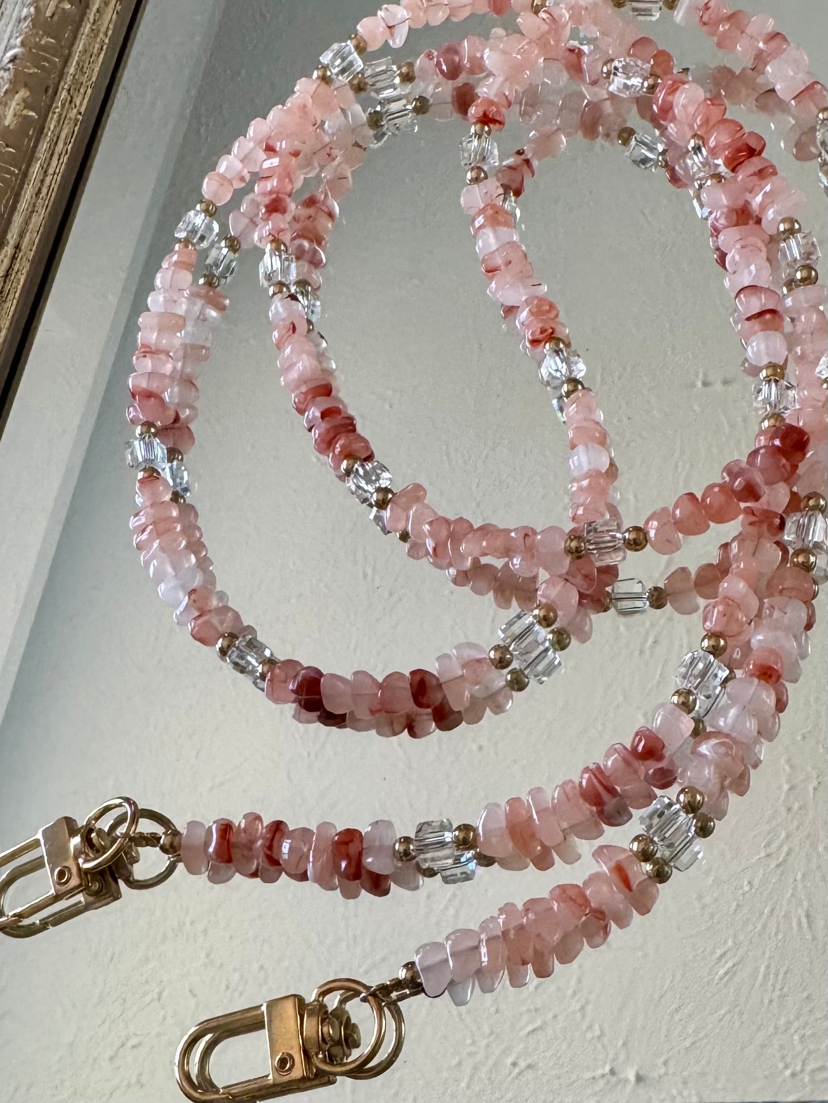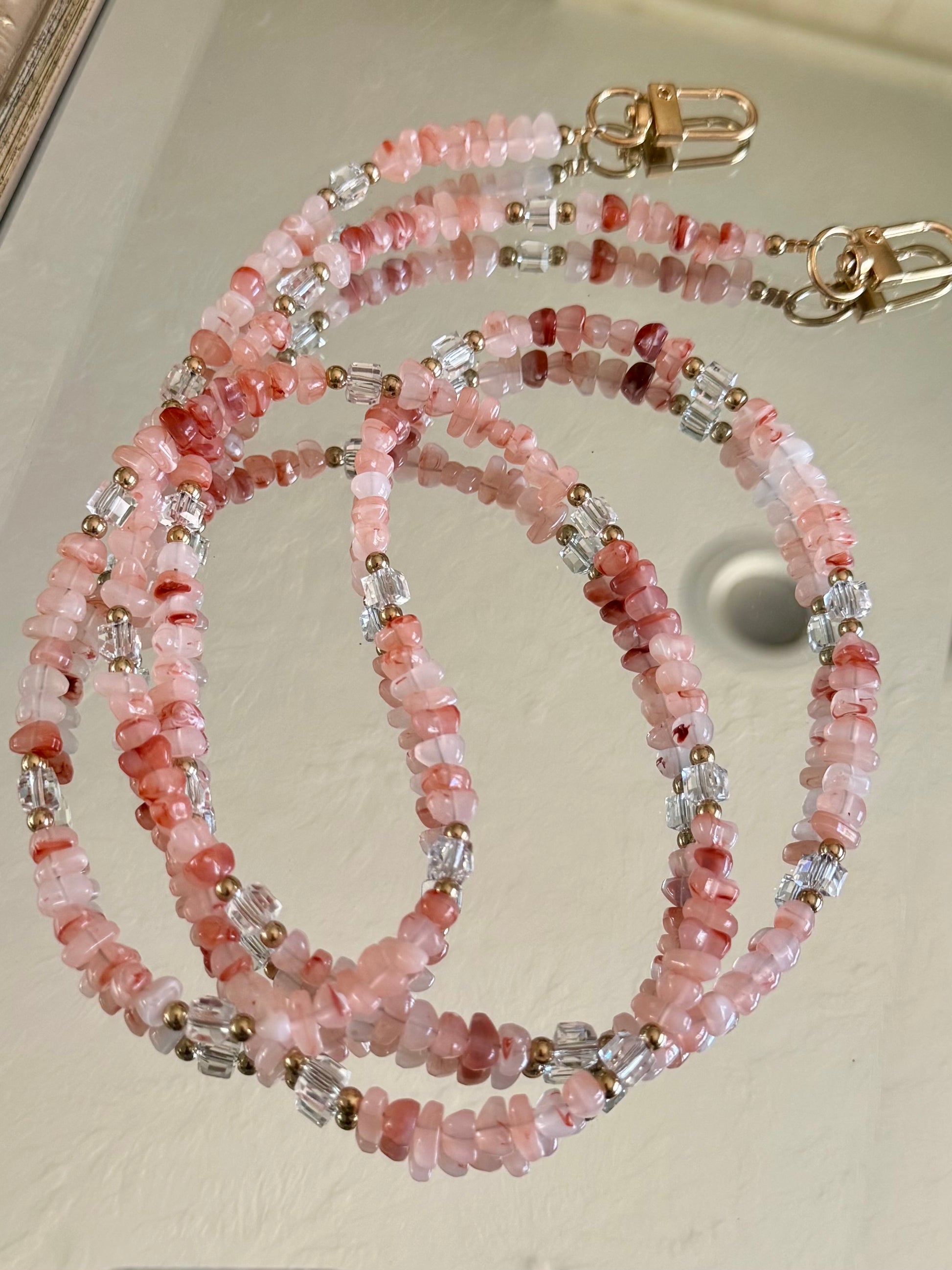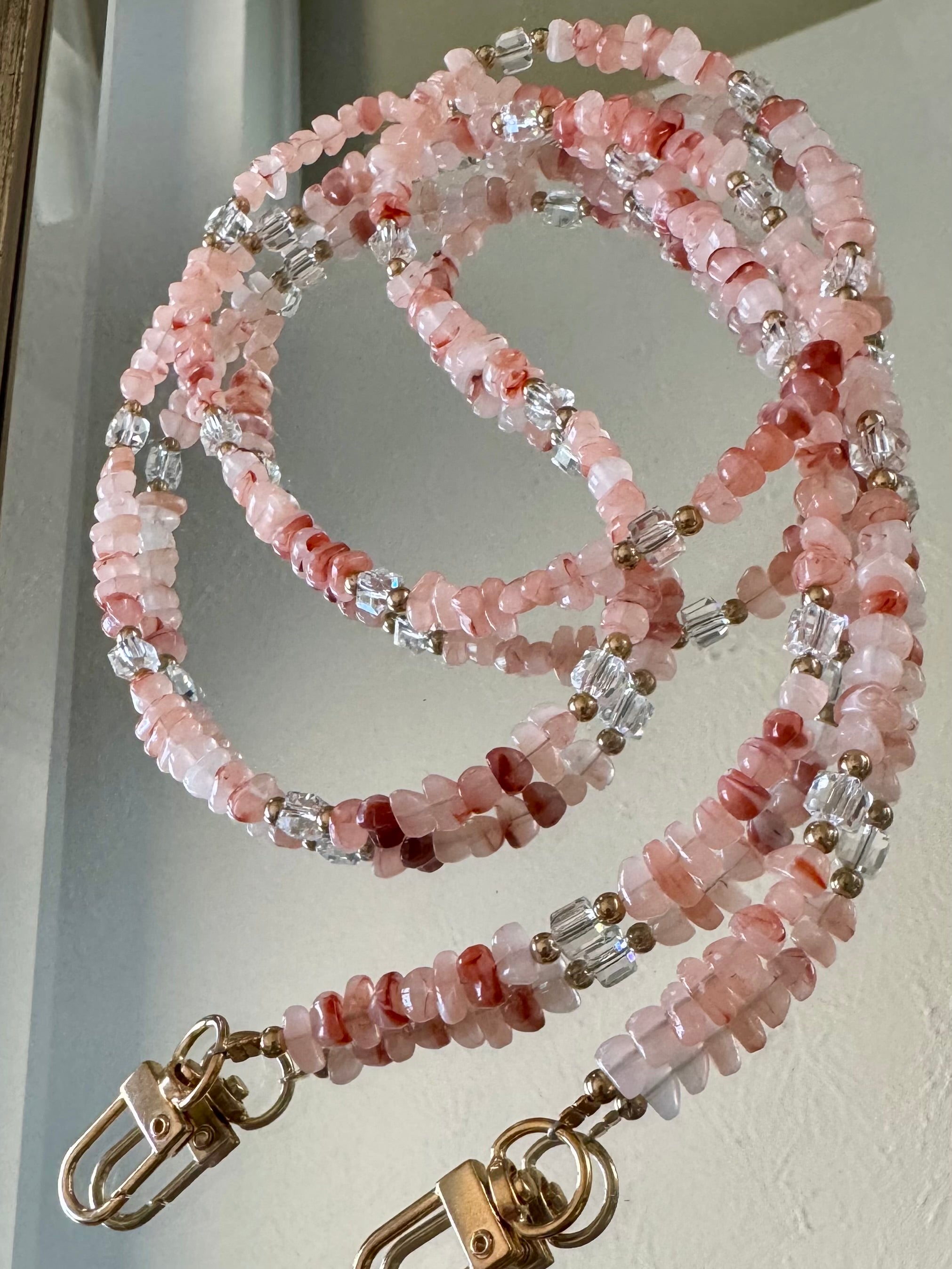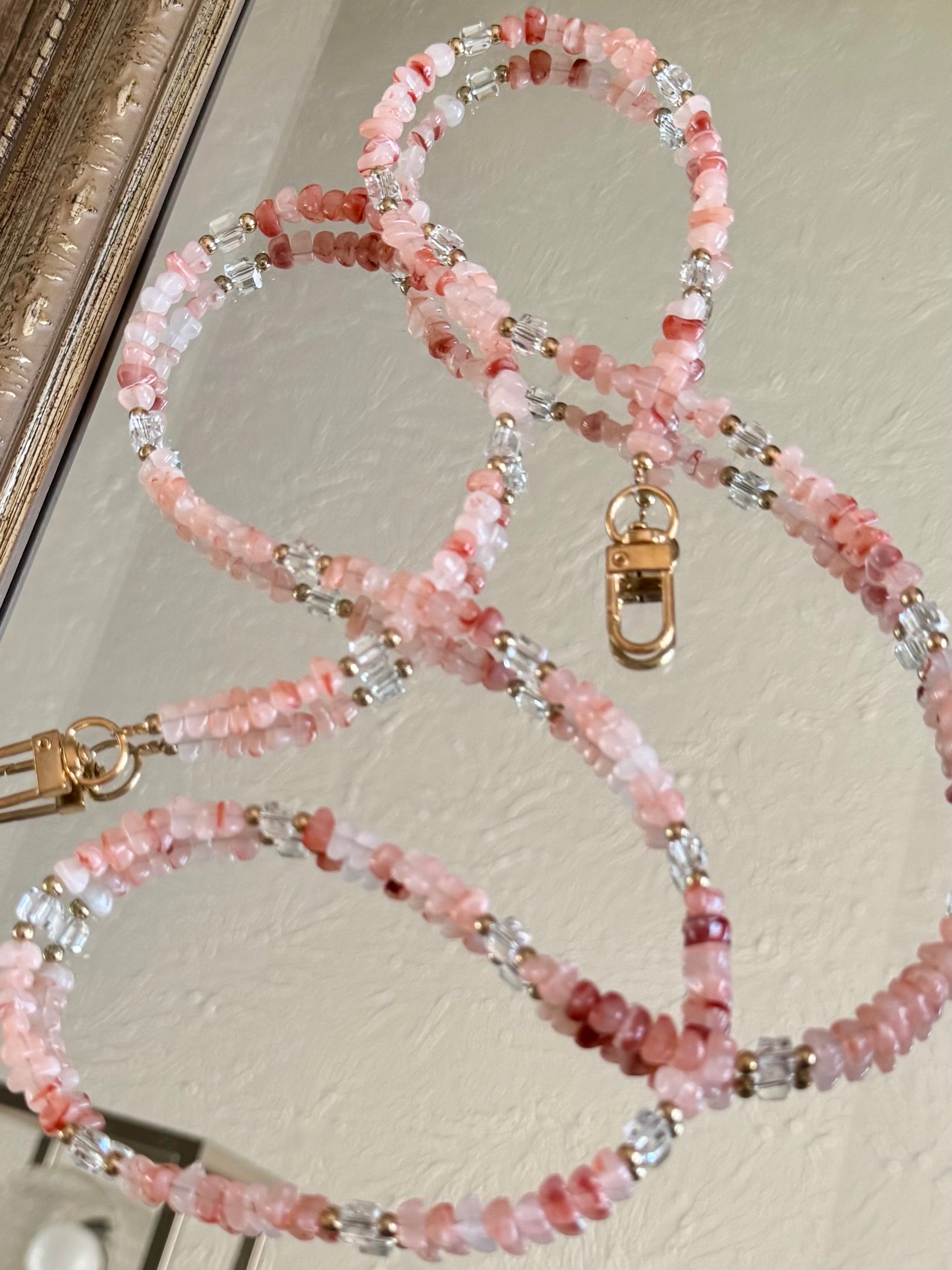 Multipurpose strap measures approx. 46 inches long, each strap is one-of-a-kind and exact stone colors/patterns will vary.