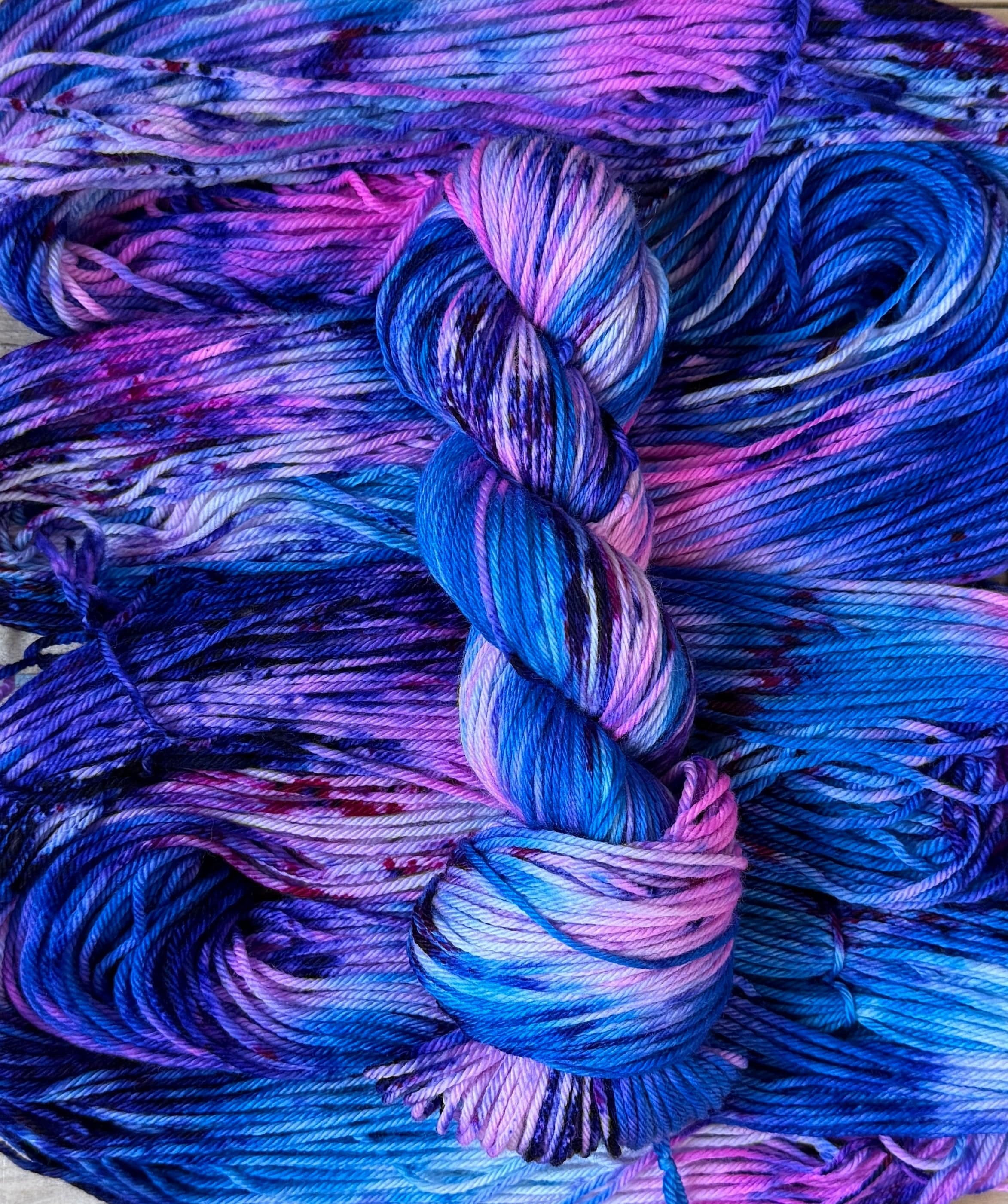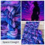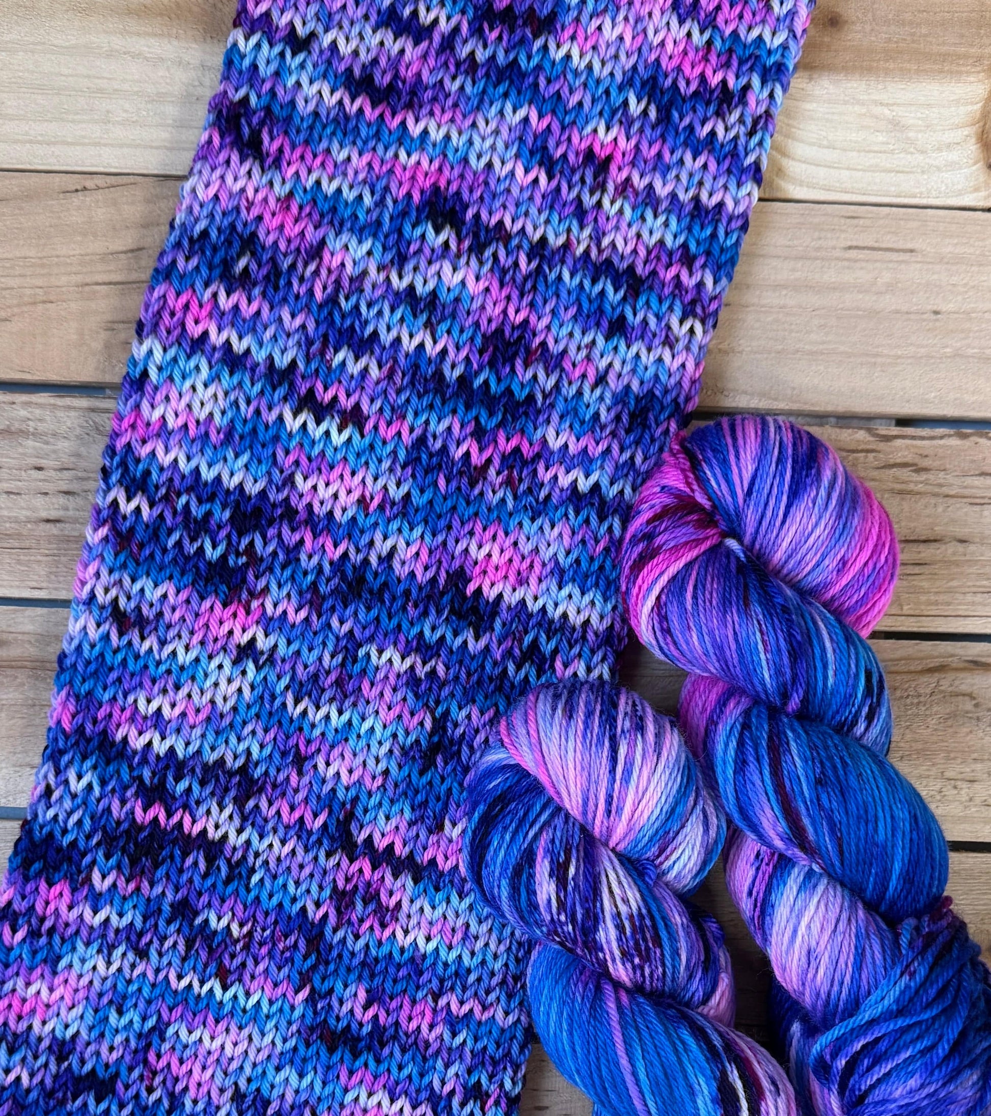 Space Cowgirl is an out-of-this-world blend of hot pinks, cosmic purples, and electric blues, streaked with dark speckles like stars scattered across the galaxy. Inspired by Kayla Blackburn’s winning pick in our Community Dye Pot, this colorway struts between neon rodeo nights and interstellar skies. It knits and crochets into bold, energetic fabric that’s perfect for statement socks, playful sweaters, or accessories that are truly stellar.
