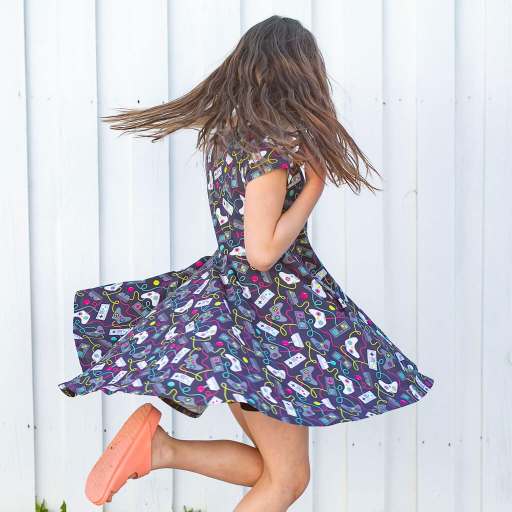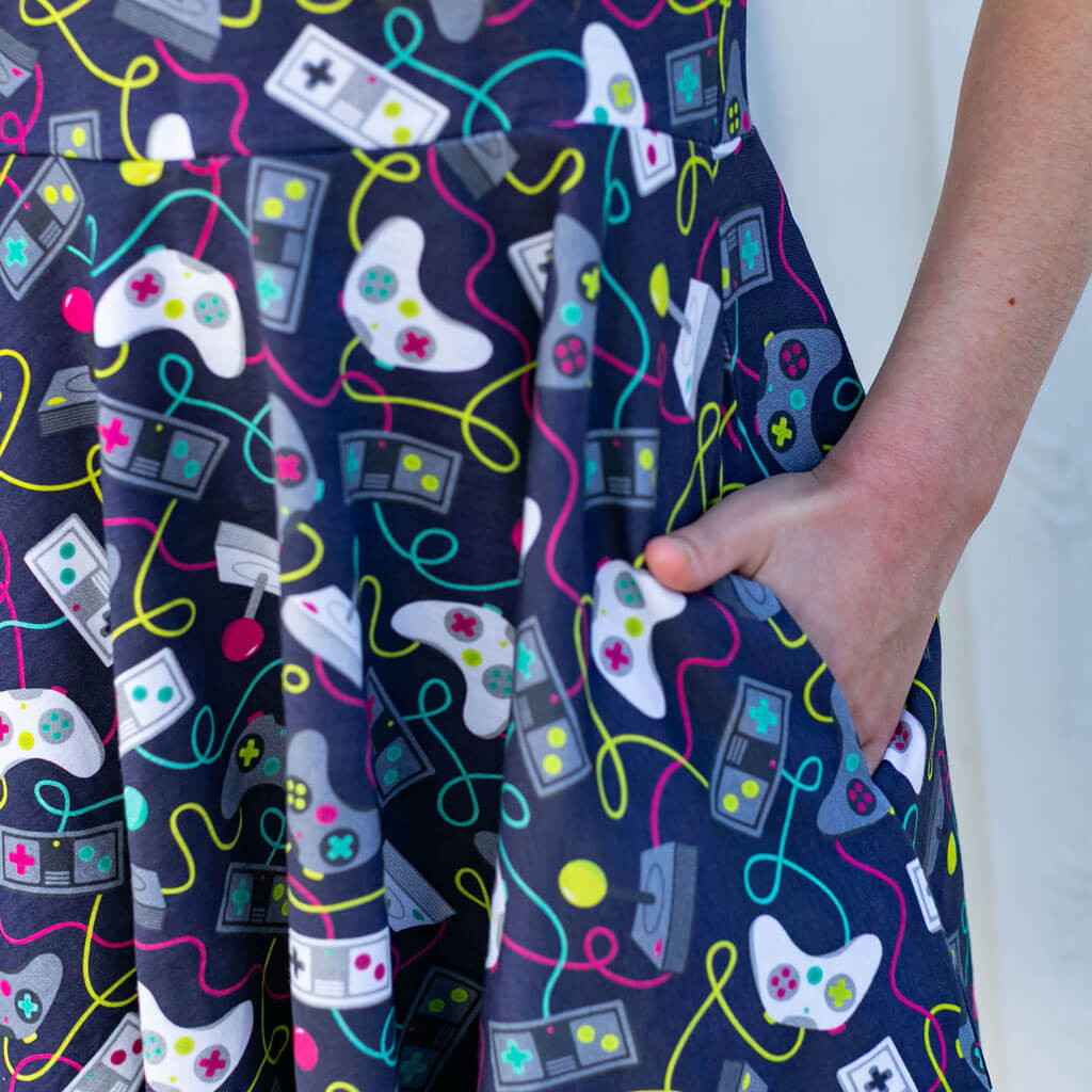 Made of soft 100% cotton with short sleeves and a full twirly skirt. Of course it has side pockets for all your gamer accessories!