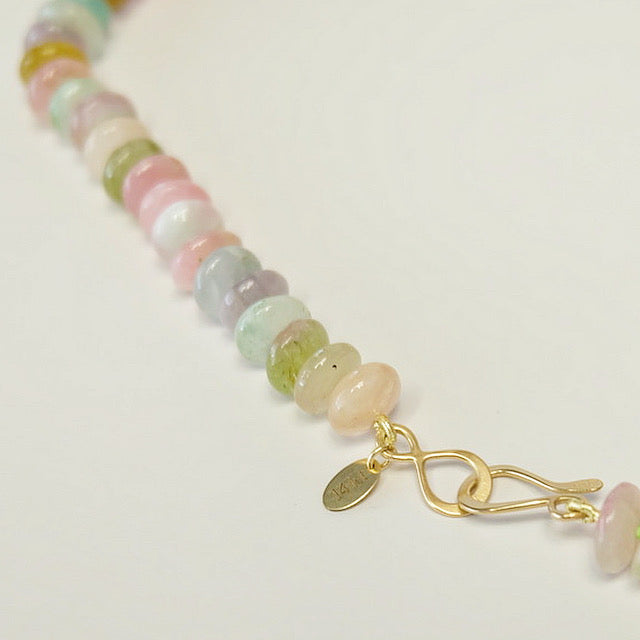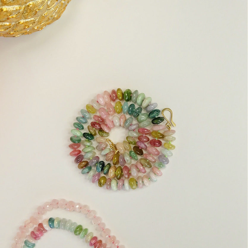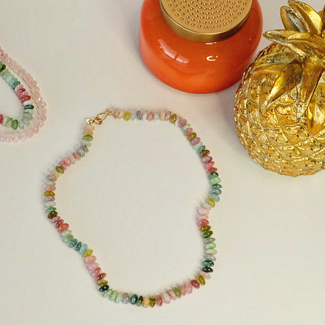 Our Watermelon Tourmaline Candy Necklace finished in 14K gold strikes a perfect balance between vibrant but not loud. Our colorful strand has bright semiprecious stones in pink, green, purple, yellow and blue.