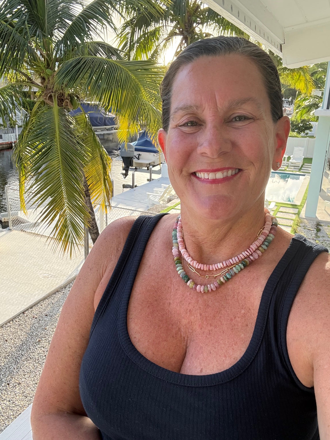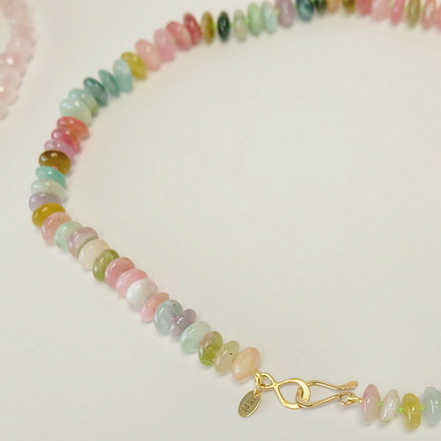 This watermelon tourmaline candy necklace layers beautifully with delicate chains, structured pendants, or even other candy strands. Pair it with crisp cottons, textured knits, or bold prints—it holds its own and plays well with others. Wear it solo for a signature pop, or layer your look around its pink and green color story.